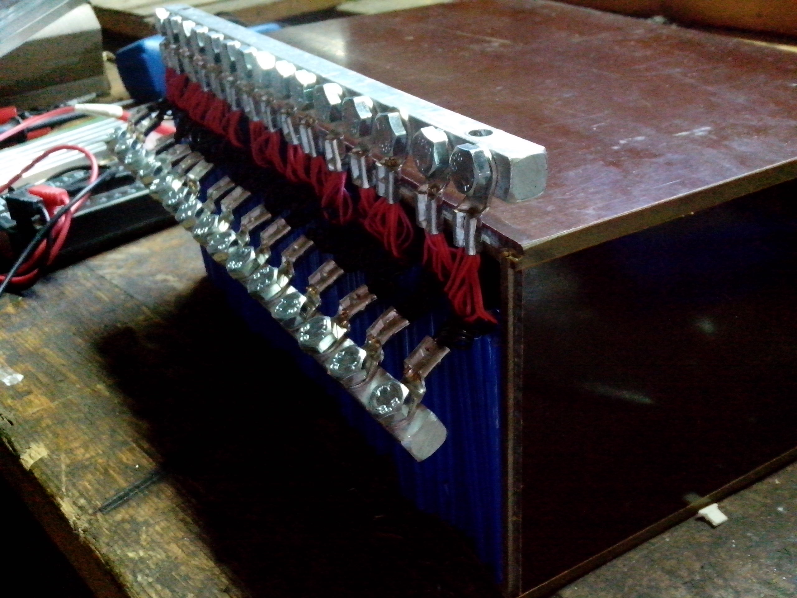 Tak jsem žluťáskům pořídil sestřičku vlastní výroby z Li-ion prisem a uvidíme co vydrží a jak se budou chovat v provozu vůči Lifepo4. Udělal jsem 15-ti článkovou bateriji a napětí by se mělo pohybovat od 3.4>3.95V na článku,svým způsobem by se tedy měly flákat. Kapacita Li-ion by měla vydat 18kWh,zatím ale nemám doděláno,ještě mě pár prisem chybí do plného stavu.Články jsem dělal tak ,aby šly kdykoli rozdělat a jednotlivé prismy jsem lisoval do ok po pěti.Ty pak jsou šroubovány na společnou sběrnici šrouby M6x10,takže mohu pohodlně přemístit jednotlivé pětice kamkoli a dorovnat celkem přesně kapacitu jednotlivých článků. U prisem jsem ponechal ochranné obvody,které vypínají přívody na prismě při podbití(2.5V) a přebití(4.3V),tak doufám,že mě barák díky nim neshoří