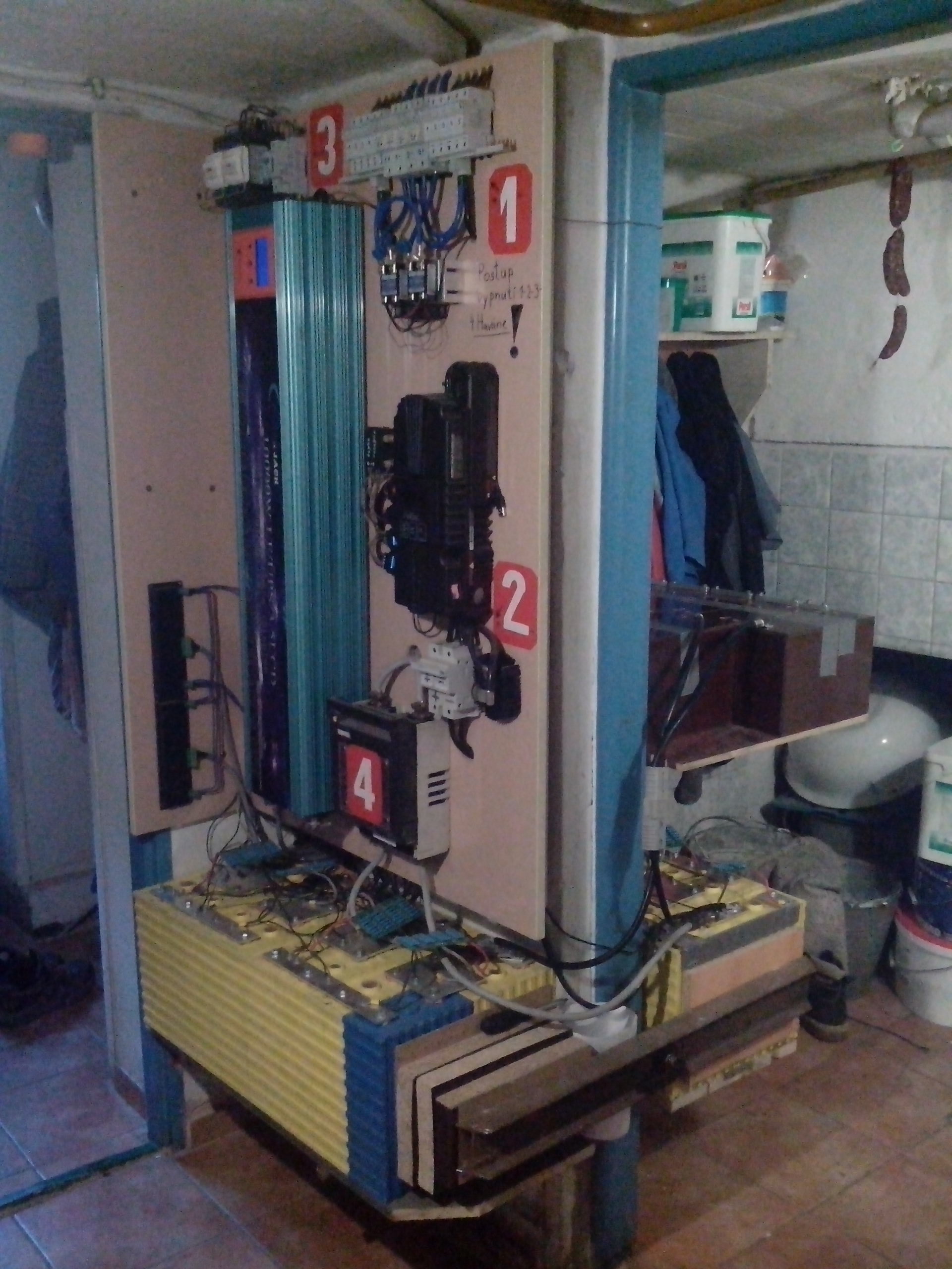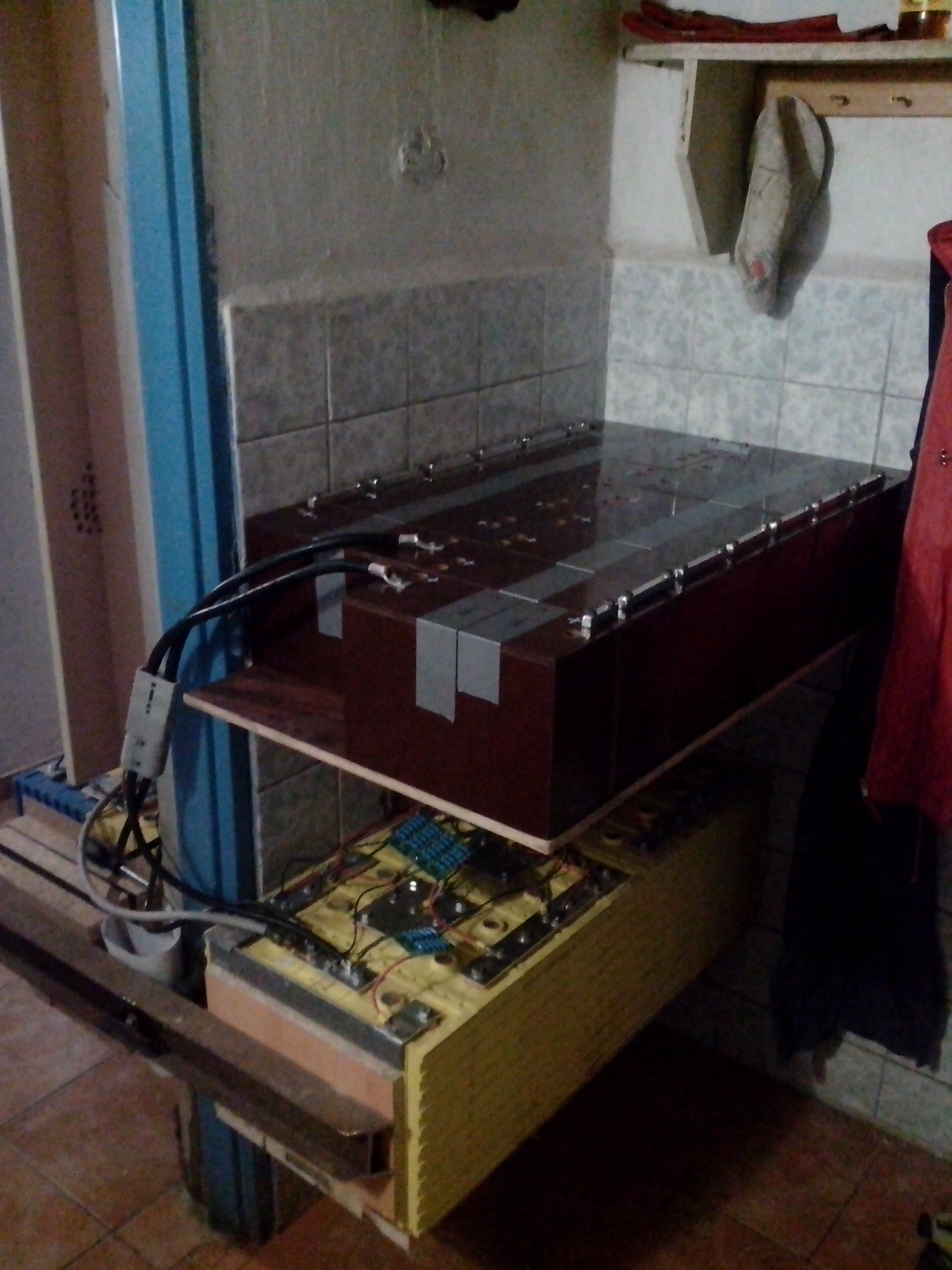 Bylo nutné zvýšit kapacitu baterky a tak tady nyní mám 34ks -200A/3,2V winstnů(jeden modrý calb),vše jeté a zapojené 400A/52V.Odpojují se v zátěži při 2,9V a v 3,49V končí absorbce a je přechod do float,po vybití se ustálí během 15min na 3,08V.V tomto rozpětí do nich regl dokáže nacpat až po absorbci asi 18kWh ,jsou to hold stařečci,ale poměr cena/výkon dobrá.A samozřejmě to není konečná už dělám bratříčky z Li-ion