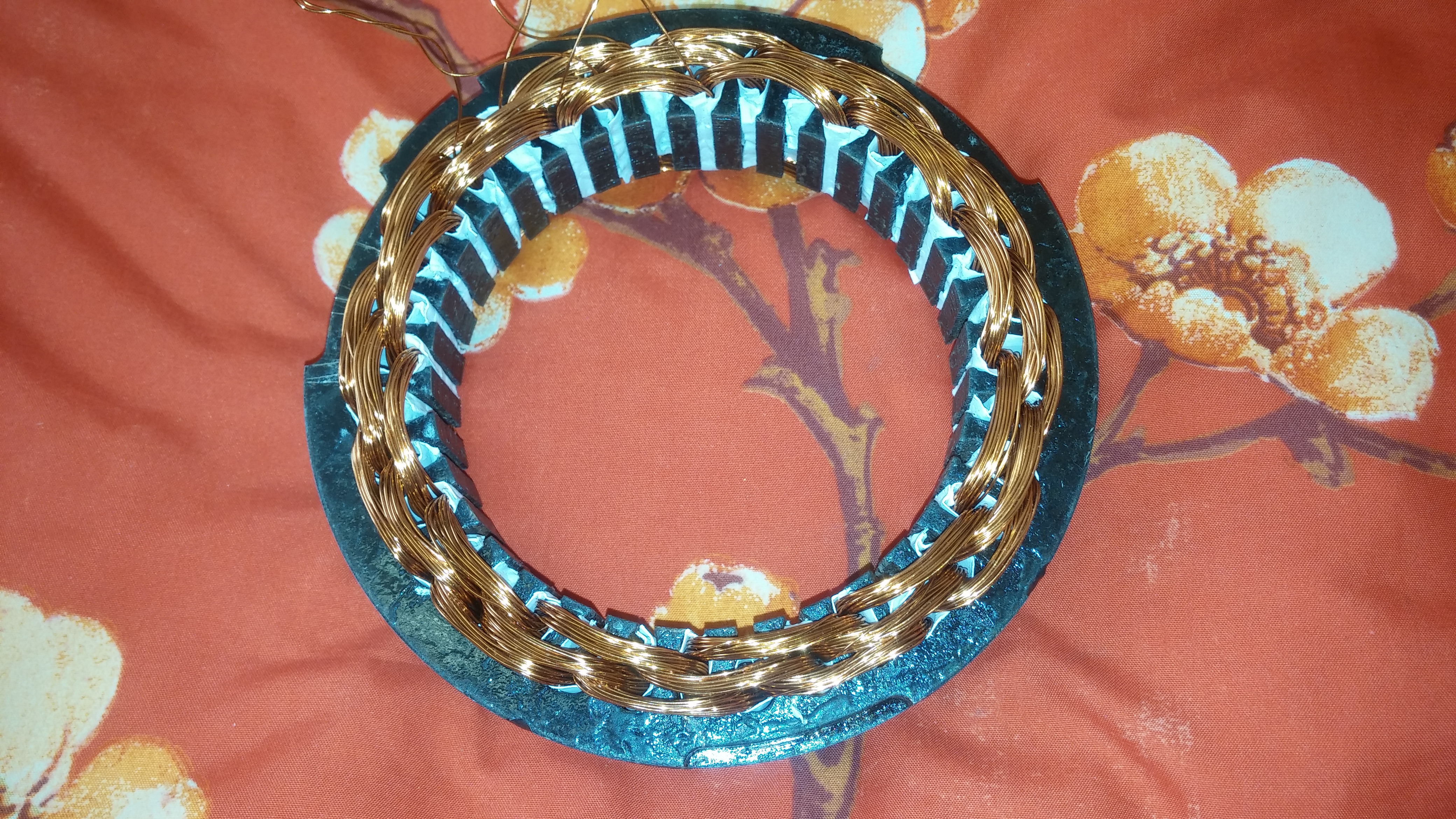 Hurá, našel jsem trochu času a konečně jsem domotal celý stator. Tak přihodím zase pár fotek. Po navinutí jsem cívky proměřil multimetrem na celistvost vinutí, tam jsem asi s desetinovou odchylkou na cca 3.2ohm-jo vím nebrat moc přesně, multimetr není na měření desetinek, ale jen jako orientační měření. A pak vůči statoru i jednotlivá vinutí vzájemně proti sobě-obojí nekonečno. (Jo kdybych našel funkční baterky, tak je prosvítím i Megmetem na 100V, ale to je fakt nepřekonatelný problém..)