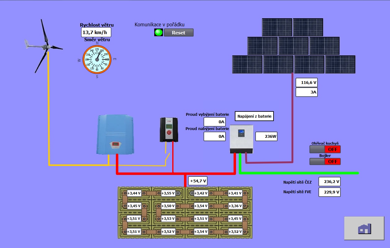 Opravdu díky za toto forum. Díky němu a Vám všem se mi podařilo dokončit malou FVE a VE. Celkem 9 panelů 260Wp, měnič Axpert 4kW 16x LiFePo4 100Ah. K tomu VE IstaBreeze "2kw" s měničem MPPT 600W a pro jistotu měnič bez MPPT 3kW. Ten 3kW je pouze nouzový, kdyby selhal MPPT 600W. Ten výkon VE je v uvozovkách schválně. Maximálně při opravdu Velkém větru dala jen 500W. I tak jsem s ní spokojen. Napětí článků na vizualizaci nejsou relevantní. Dneska jsem doinstaloval pumpy od Mandy a tak mě čeká doladění měření. Jinak data čtu rovnou z Axperta do Arduina a potom vše do PLC přes ethernet. PLC řídí celý dům (osvětlení, topení a pod). Potřebuji ještě dodělat nabýjení bojleru z přebytků. Ale 2kW spirála je moc Velká na tak malý sytém. Napadlo mě omezit výkon diodou a pouštět jen jednu půlvlnu. Nezkošel to někdo? Jak se bude chovat měnič?