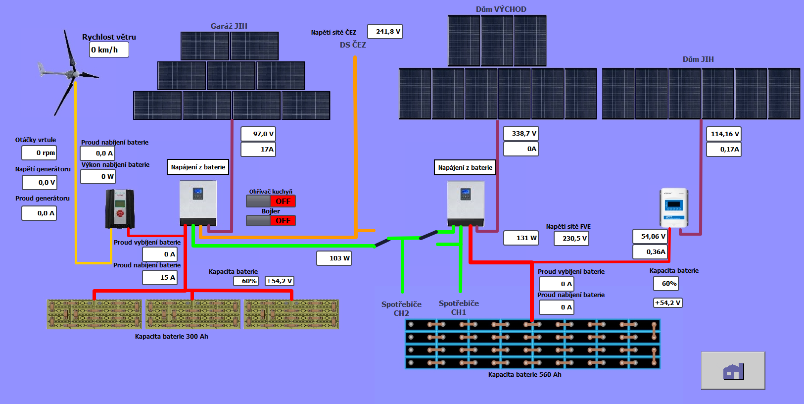 Opravdu díky za toto forum. Díky němu a Vám všem se mi podařilo dokončit malou FVE a VE. Celkem 9 panelů 260Wp, měnič Axpert 4kW 16x LiFePo4 100Ah. K tomu VE IstaBreeze "2kw" s měničem MPPT 600W a pro jistotu měnič bez MPPT 3kW. Ten 3kW je pouze nouzový, kdyby selhal MPPT 600W. Ten výkon VE je v uvozovkách schválně. Maximálně při opravdu Velkém větru dala jen 500W. I tak jsem s ní spokojen. Napětí článků na vizualizaci nejsou relevantní. Dneska jsem doinstaloval pumpy od Mandy a tak mě čeká doladění měření. Jinak data čtu rovnou z Axperta do Arduina a potom vše do PLC přes ethernet. PLC řídí celý dům (osvětlení, topení a pod). Potřebuji ještě dodělat nabýjení bojleru z přebytků. Ale 2kW spirála je moc Velká na tak malý sytém. Napadlo mě omezit výkon diodou a pouštět jen jednu půlvlnu. Nezkošel to někdo? Jak se bude chovat měnič?
