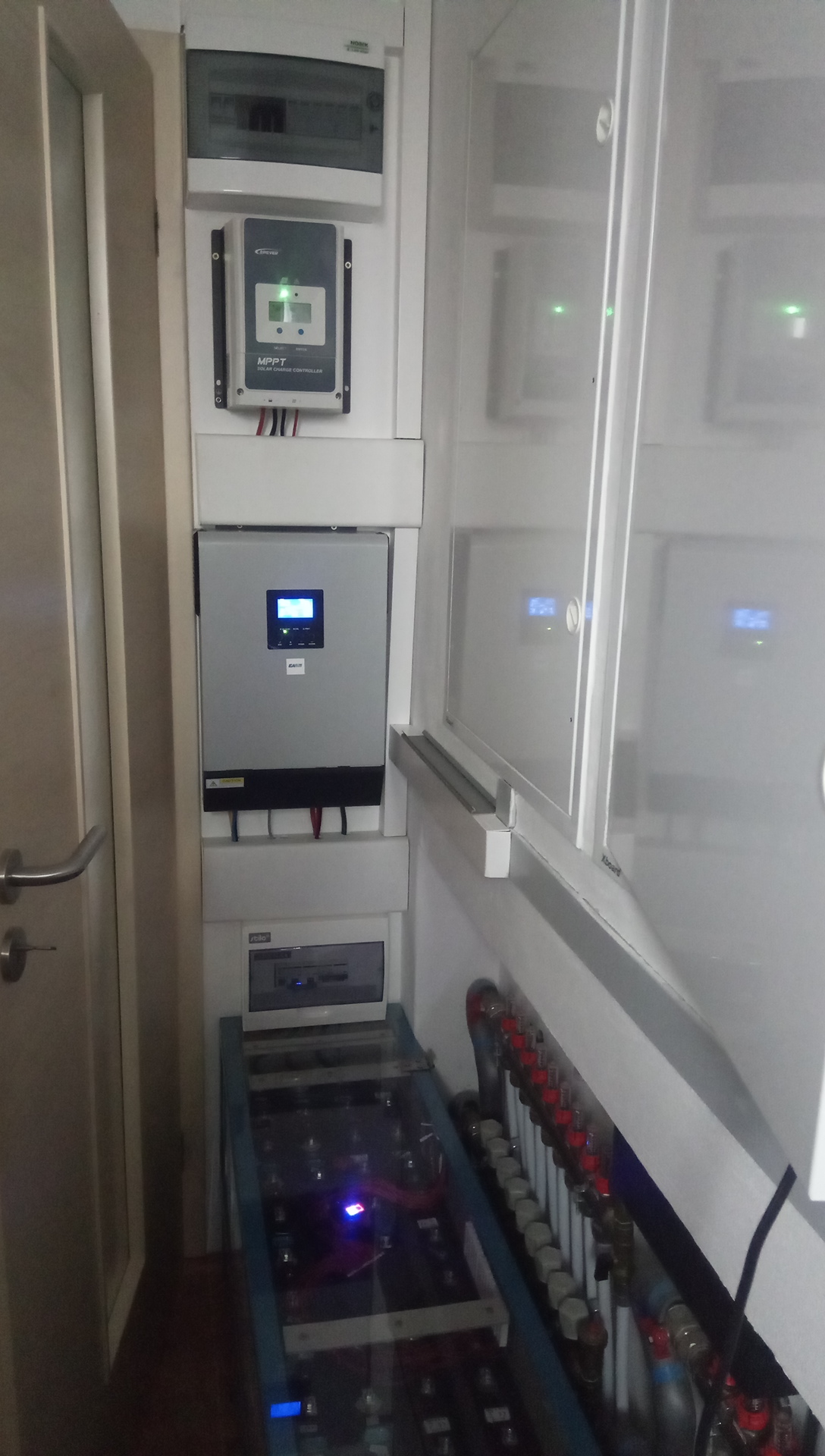 Tak koneečně jsem dokončil upgrade, nebo spíše novou výstavbu FVE2. Přibyly nové baterie, nový klon Axperta a jejden Epewer. Vše je v zádveeří kotelny.. Je to opravdu minimalistické. Ale funkční