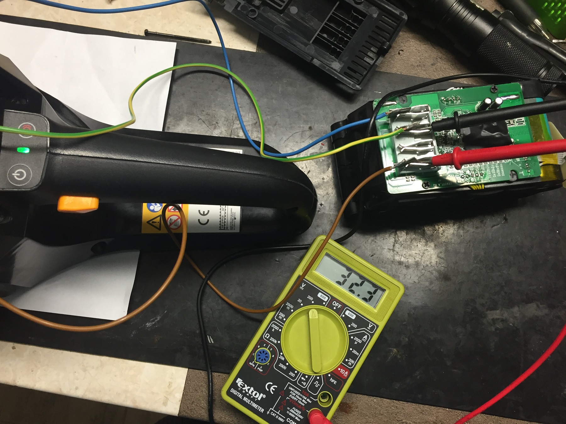 Baterie není plně nabitá trošku jsem řezal,plně nabitá baterie má 40V,na tolik ji nabíjí originální nabíječka asi v souvislosti s tím jak jsem tu četl že když se 18650 nabíjí jen na 4V tak má o mnoho delší životnost.