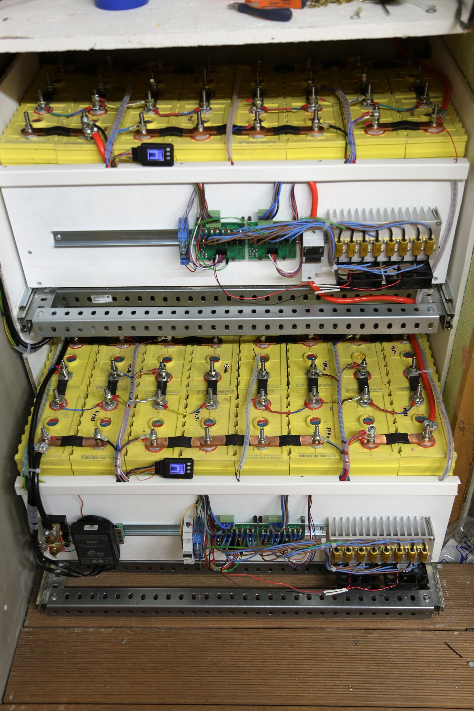 Protoze me vetsina lidi zrazovala od lezicich baterii, tak jsem je otocil spravne. Je ale malo mista, a tak jsem vymyslel takove dva supliky, jsou na pojezdech accuride co uvezou 150kg. konstrukce z 10mm cetris desek natrenych primalexem, takze snad nehorlava. Police sesroubovane z pozink uhelniku. Na predni stranu jeste prijde madlo a plexi.