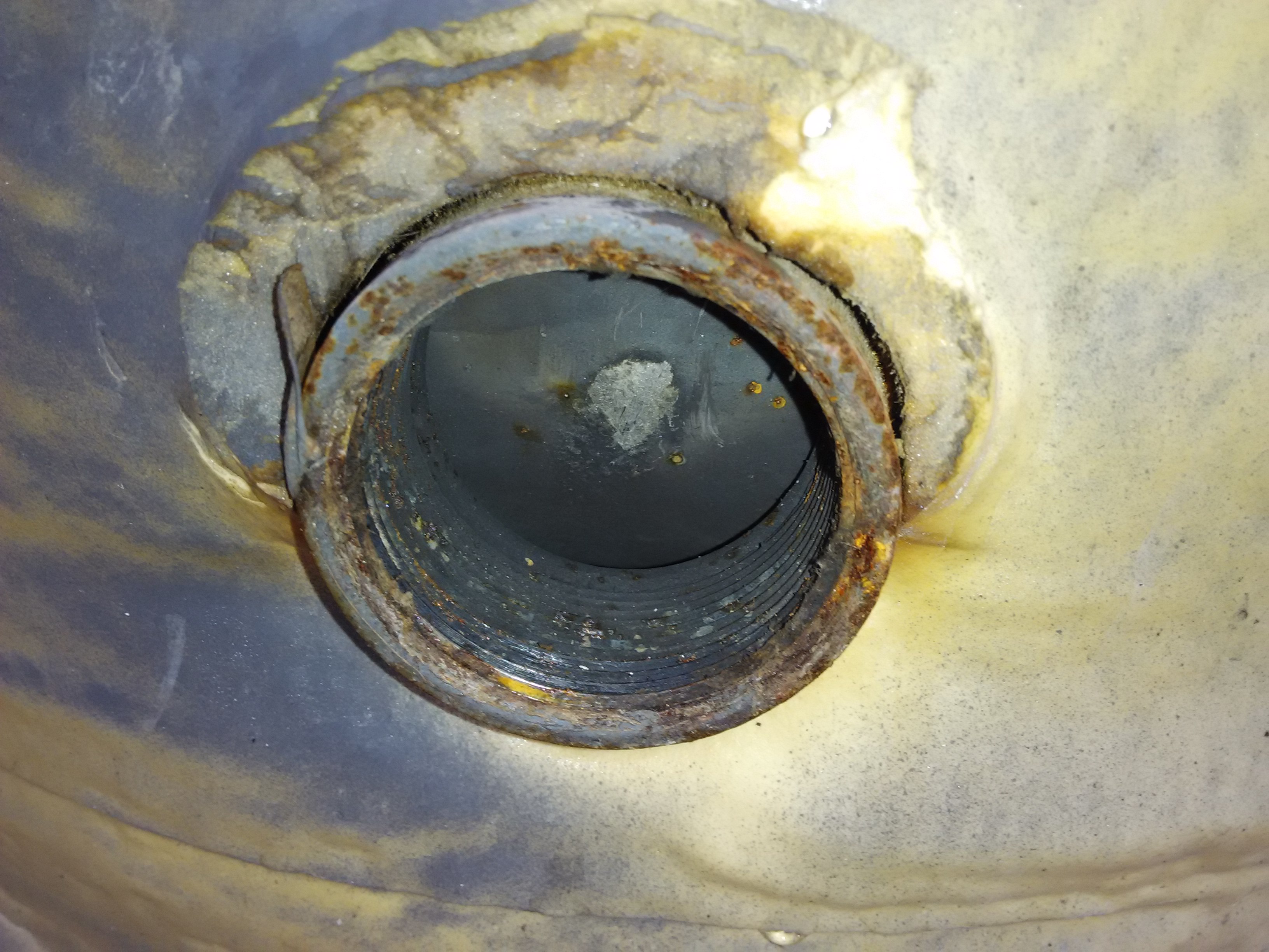 Tak slíbené foto. Je to opravdu nerezová nádrž (zkoušeno magnetem) v nádrži z obyčejné oceli. Šachta na teplotní čidlo jde až do asi poloviny hloubky nerezové nádrže. Dokonce jsem pozůstatky 2 čidel v různé hloubce v jedné nádrži objevil. Tři nerezové trubky jdou jedna až ke dnu, druhá asi do poloviny a třetí je ukočena nahoře.