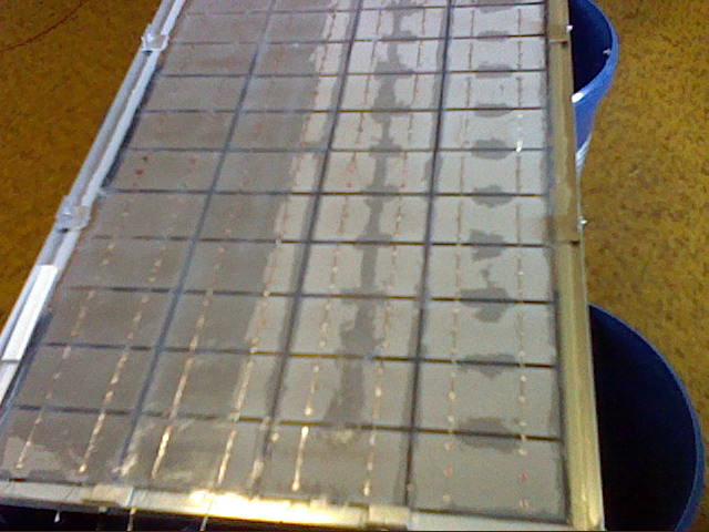 Je to tak, články jsem spojoval po 6 kusech, položil na očištěné sklo,spájel, položil jsem na ně knížky pro zatížení a spoje přemáznul silikonem.Na druhý den knížky odstranil a přimáznul silikonem všechny články a zbylé spoje. Protože to byly použité články , jeden jsem musel na střeše měnit. A nebyl problém, ulamovací nůž, oříznout, vyndat(odletovat) starý a vložit, přiletovat a přemáznout. Systém je vidět na prostředním a dalším obrázku. Panel běžně ostříkáván vodou i zezadu, zatím nic. Silikon je to asi tento:http://www.denbraven.cz/silikony-elasti ... -cz65.html. Spotřeba cca 3 kg. Barva průhledná ale to není až tak podstatné. Zkouška odtržení od skla a nebo rámu je bez šance, možná kombinačky. (nebo krumpáč)