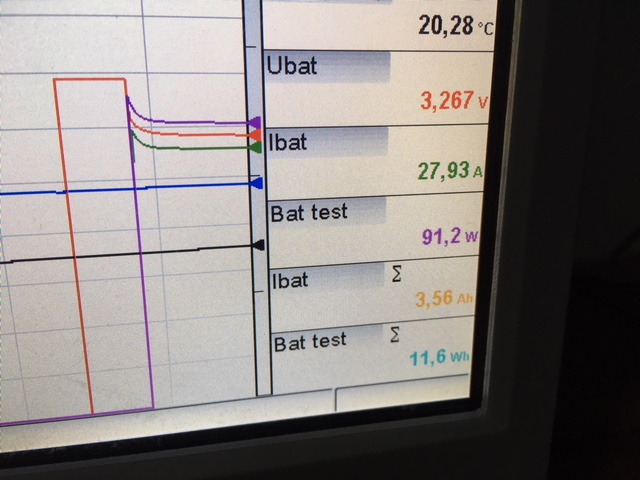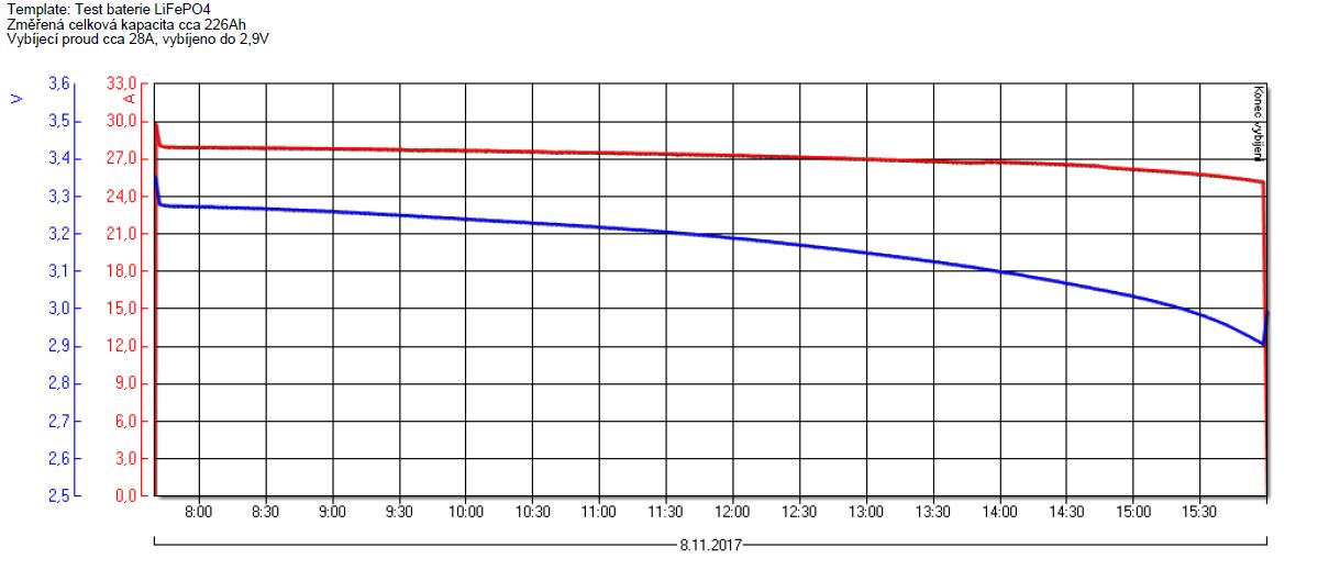 já mám 16ks žlutých 200Ah Winstonů z roku 2009 (vyrobeny ve třech různých měsících). Kupoval jsem je loni jeté. V zimě jsem dělal kapacitní test všech článků a vyšlo to následovně: 206-210Ah - 9ks; 215-220Ah - 3ks; 222-226Ah - 3ks; 234Ah! - 1ks. Bylo testováno z plného nabití a následném ustálení několik hodin, takže start někde 3,4V, konec vybíjení 2,9V. Vybíjecí proud cca 28A (start 30A, konec 25A. Vybíjel jsem do spirály s železného drátu 3,15mm, chlazeno ventilátorem), viz. obr. Bylo to měřené na celkem přesném bočníku - 0,5% a 24 bit převodníkem, sumováno každých 100ms, takže myslím, že chyba bude max. +- 2Ah