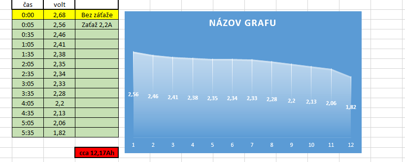 Dnes v noci som mal cas tak som urobil kapacitný test, podla predajcu 12Ah. Záťaž som použil 2,2A - teda cca 0,2C.