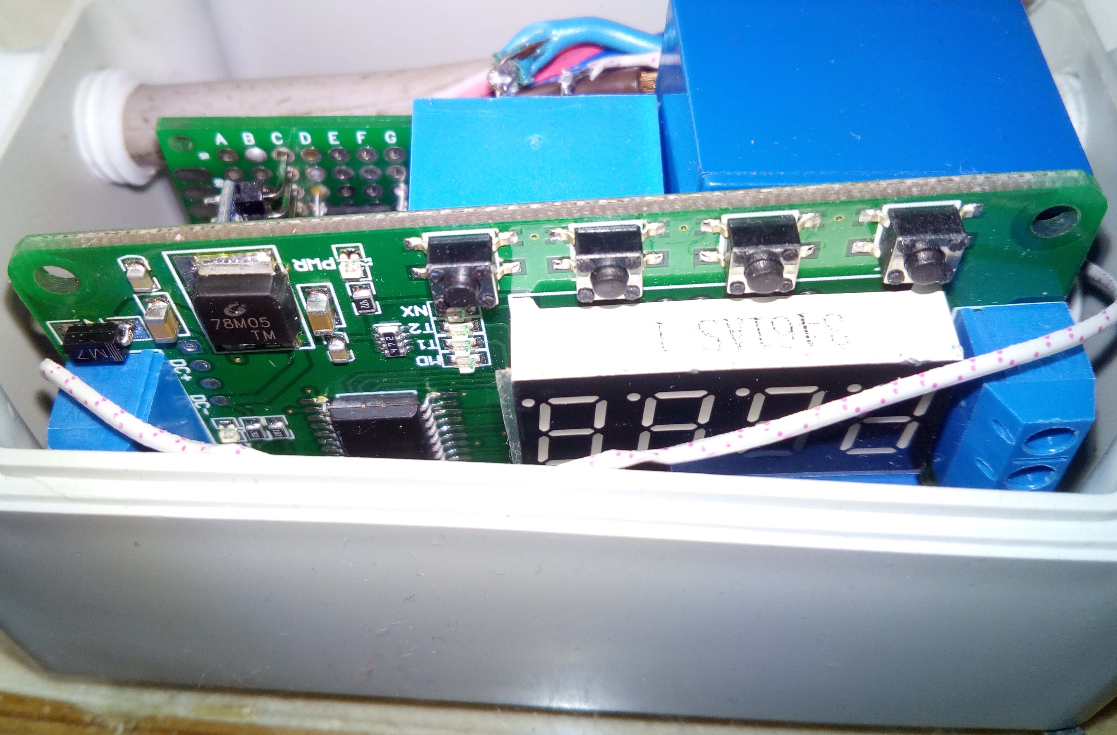 Jsou vidět programovací tlačítka na univerzálním relé, pomocí kterých tady nastavuji funkci a časové zpoždění relé. Vše pájitelné je na univerzální destičce.