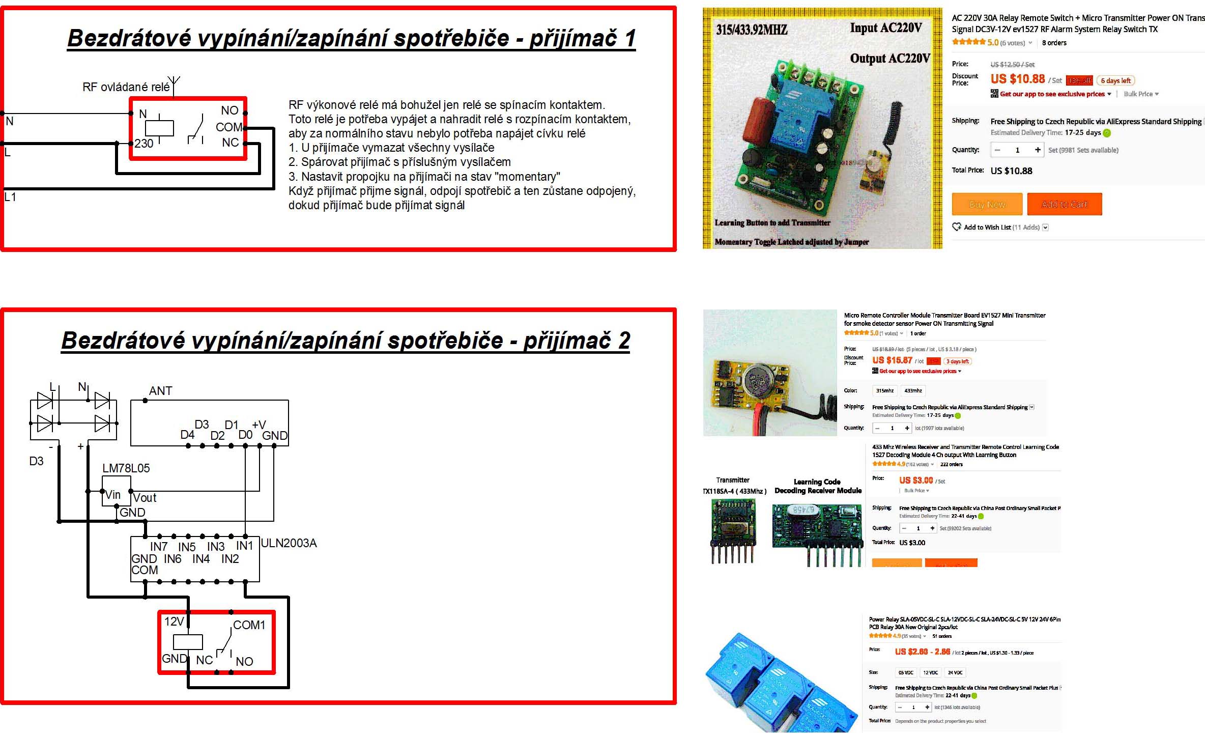 Varianta s ULN2003A je na fotkách - tam jsou komponenty pájeny na univerzální destičku. Je to kanón na vrabce, ale levnější, skladnější a univerzálnější, než ochraná dioda na indukčnosti. Univerzálnější proto, že některé vysílače + přijímače jsou vícekanálové a je tak příprava na vícestupňové řízení.