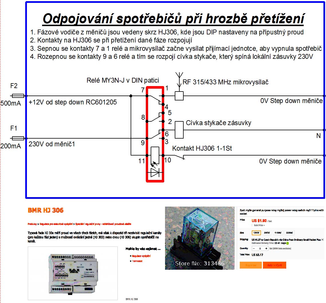 Při přetížení začne vysílat RF vysílač, nebo jako ve schématu ještě navíc odskočí relé stykače zásuvek.