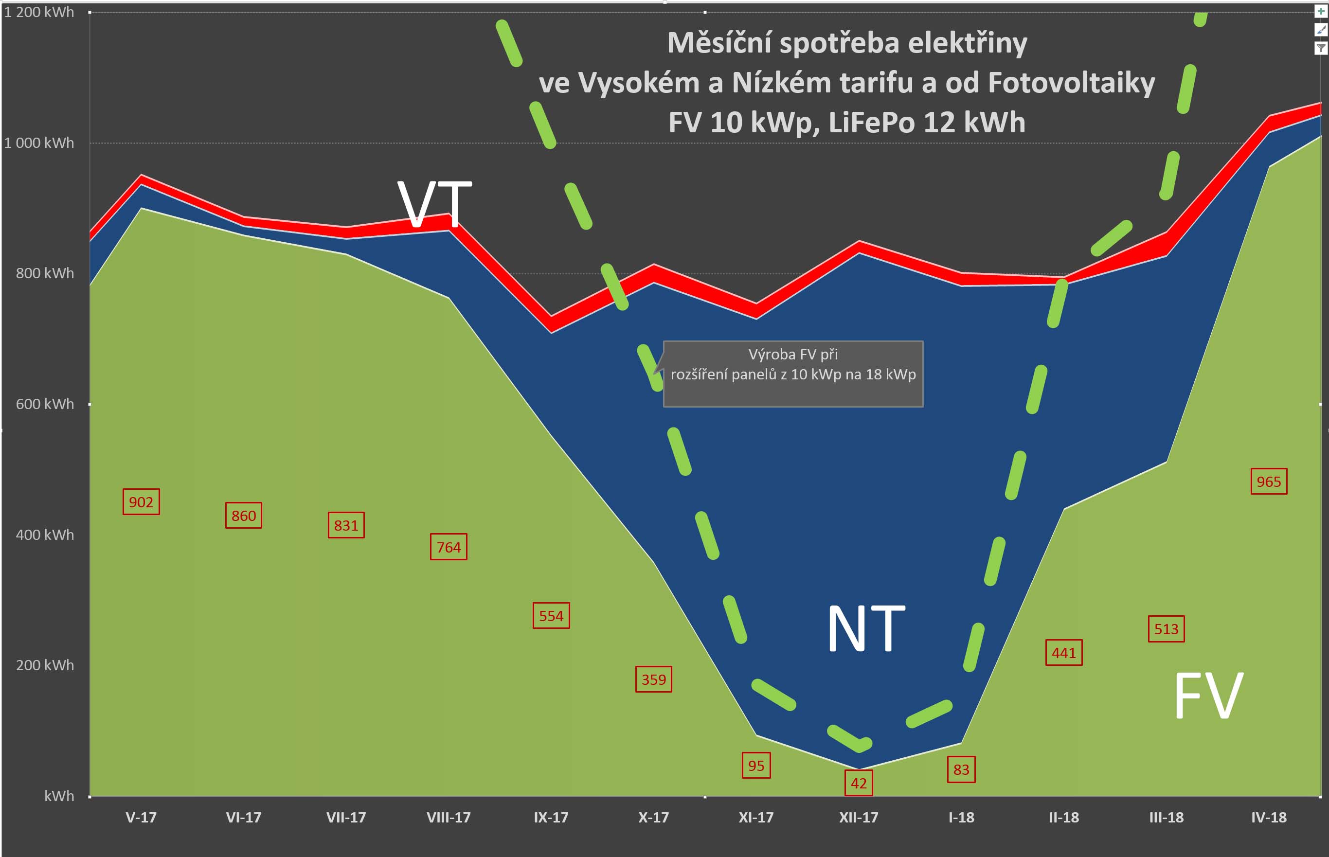 Elektrárna má 10 kWp, do baterie se vejde 12 kWh. Přitom při roční spotřebě 10 MWh (denní je 30 kWh) FV pokryje 6.2 MWh.