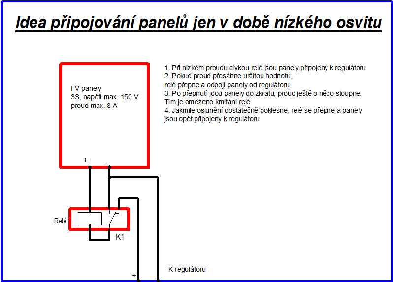 Pro zvýšení soběstačnosti je potřeba zvýšit plochu FV panelů. Tyto extra panely jsou potřeba na to, aby v době bez oslunění panely dávaly aspoň něco. Když svítí Slunce, není potřeba, aby byly připojeny, protože už stávající panely dávají při oslunění tolik, kolik jsou schopny regulátory zpracovat a kolik je možné do baterií dodávat. Proto by bylo vhodné, aby tyto extra panely dodávaly jen tehdy, když nejsou osluněny. Ideu, jak to dělat mám na schématu, ale nevím, jestli existuje vhodné Relé (stykač, proudové relé), které by vyhovovalo těmto požadavkům. Optimálně, kdyby se dalo umístit co nejblíže panelům a nevyžadovalo externí napájení. Řešil to někdo úspěšně a jednoduše?