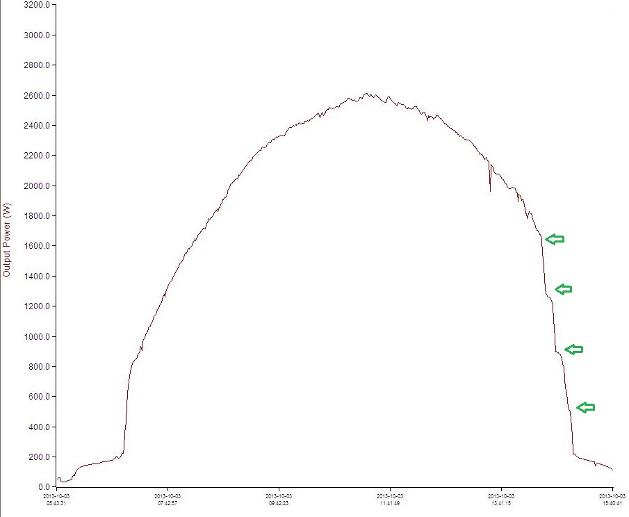 . Až mraky přiměly regl více zacloumat s napětím stínem postiženého stringu natolik že došlo k "aktivaci" bypass diod přemosťujících kulhající zastíněná místa .