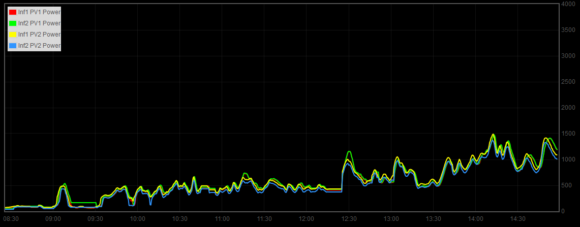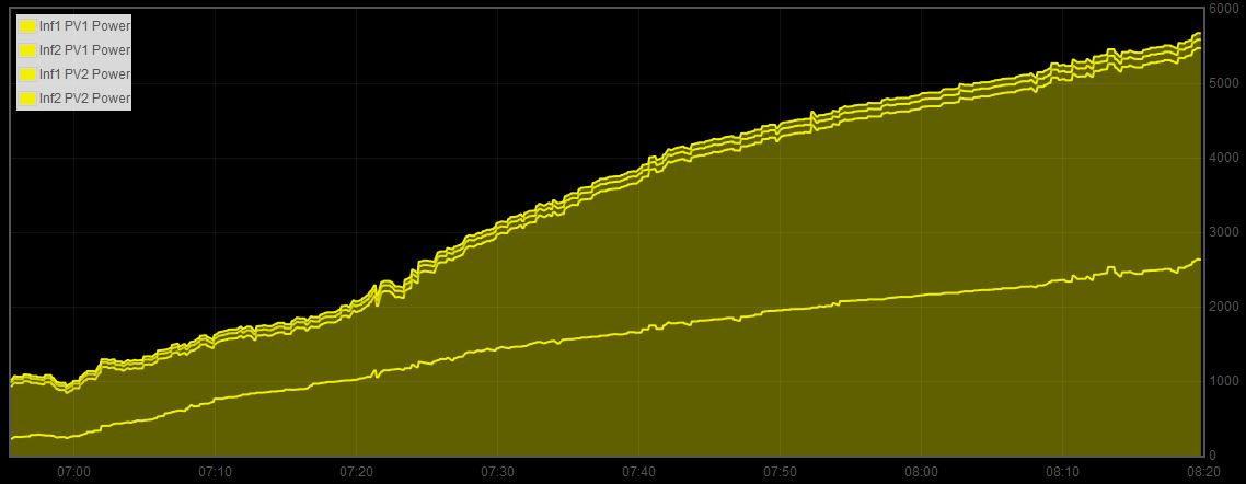 A dnes od rána tu máme přesně takové počasí, takže ideální příležitost si chování panelů omrknout. Jak to tedy vypadá? Pro ty, kteří nečtou moji laboratoř od začátku doplňuji, že mám celkem 4 identické stringy polykrystalů. Dva stringy míří na východ, dva jsou na západ. Pokud je venku pouze difuzní světlo, všechny stringy mají plus-mínus stejný výkon, tak jak je vidět z předchozího grafu. Docela by se chtělo říct, že v tomto případě by stejný výkon mohl mít i severní string (takový já ale naštěstí nemám). Celkový výkon vypadá takto:Z instalovaných 20kWp to dopoledne tahalo cca 2kW. Pak se mírně rozjasnilo a výkon začal oscilovat okolo 4-5kW. Slunce stále není vidět a všechny stringy tedy vyrábějí stejně, bez ohledu na orientaci.