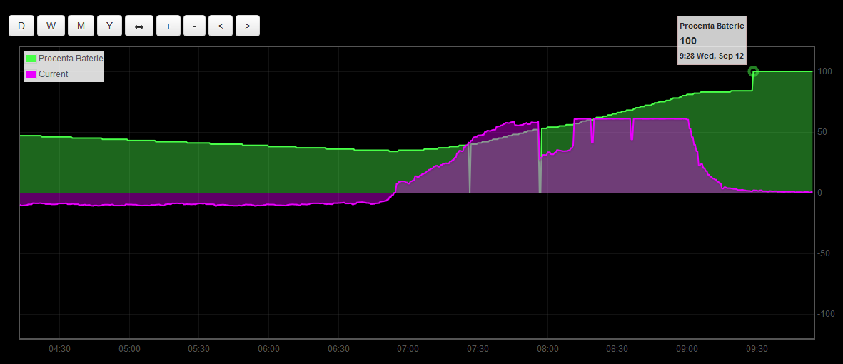 Tak máme 9:30 a baterka je dobitá na plných 10kWh. Zbytek dne až do večera se pojede jenom ze sluníčka