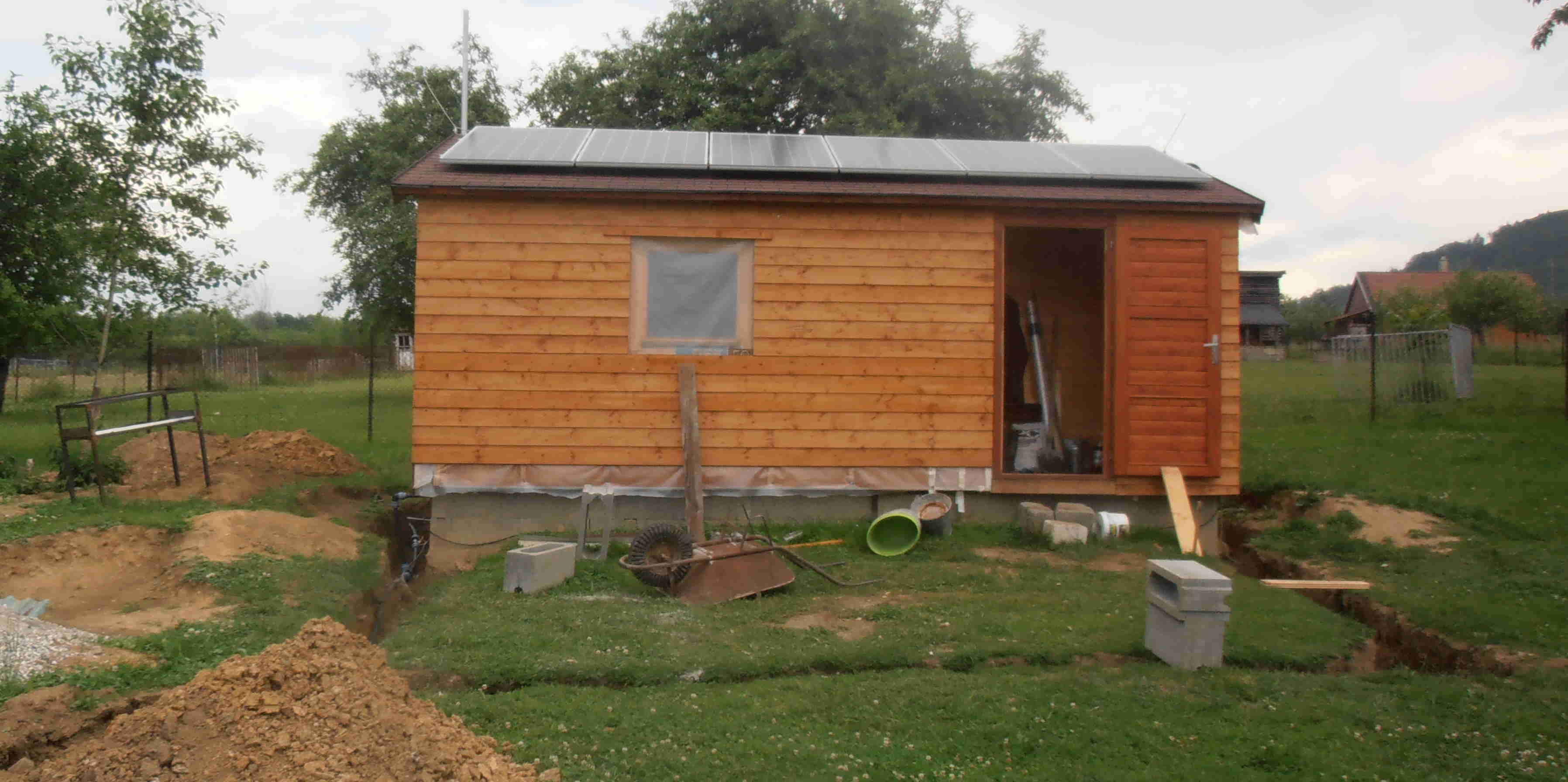 Tato 48V solární hračka napájí chatku. V ceně byla elektroinstalace osvětlení i zásuvky vše na standardních 230Vac i hromosvod a uzemnění. Dále se doinstalovali 4 sloupy se zásuvkami a s 8 kusy 50W LED refektory pro osvětlení okolních pastvin s ovcemi. Čerpadlo a rozvod vody. V chatce je TV, elektrický přímotop, zabezpečovačka, kamerový systém. Možná by na to šlo získat dotaci se zelená úsporám tuším 35 tisíc Kč pro systémy bez připojení do DS, ale tato chatka není asi zapsána v katastru a investor to nechtěl řešit.