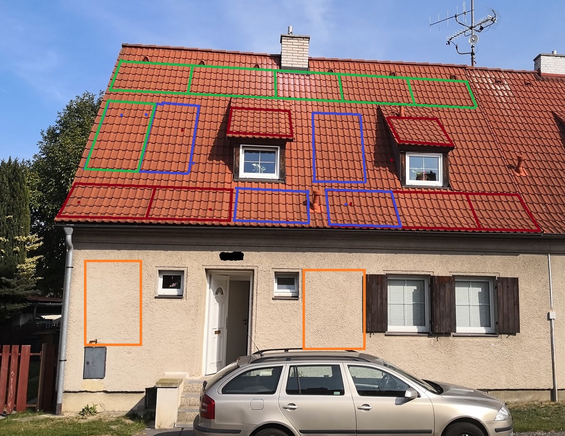 jelikož barák ti kouká na Jiho-Západ, tak v době největšího osvitu (poledne) budeš mít pořád ještě velké stíny od vikýřů: Zkus si o víkendu udělat pár fotek, jak se stíny každou hodinu posunují. Pokud se to potvrdí, tak dlouhý string můžeš udělat jen v prostoru ohraničeném zeleně. Zároveň však bude potřeba vyřešit nebo zohlednit objekty, na které ukazují šedé šipky. Pokud umístíš panely i do červeného prostoru, budou potřebovat samostatný, kratší string. Otázkou je, zda-li najdeš all-in-one, který bude mít takový rozsah vstupního DC napětí, aby na jednom MPPT vstupu dokázal efektivně zpracovat dlouhý string, zatímto na druhém MPPT bude string kratší. Pohodlnější je mít vždy u všech stringů stejnou délku, pak je můžeš přepojovat dle libosti nebo dokonce spojit paralelně.