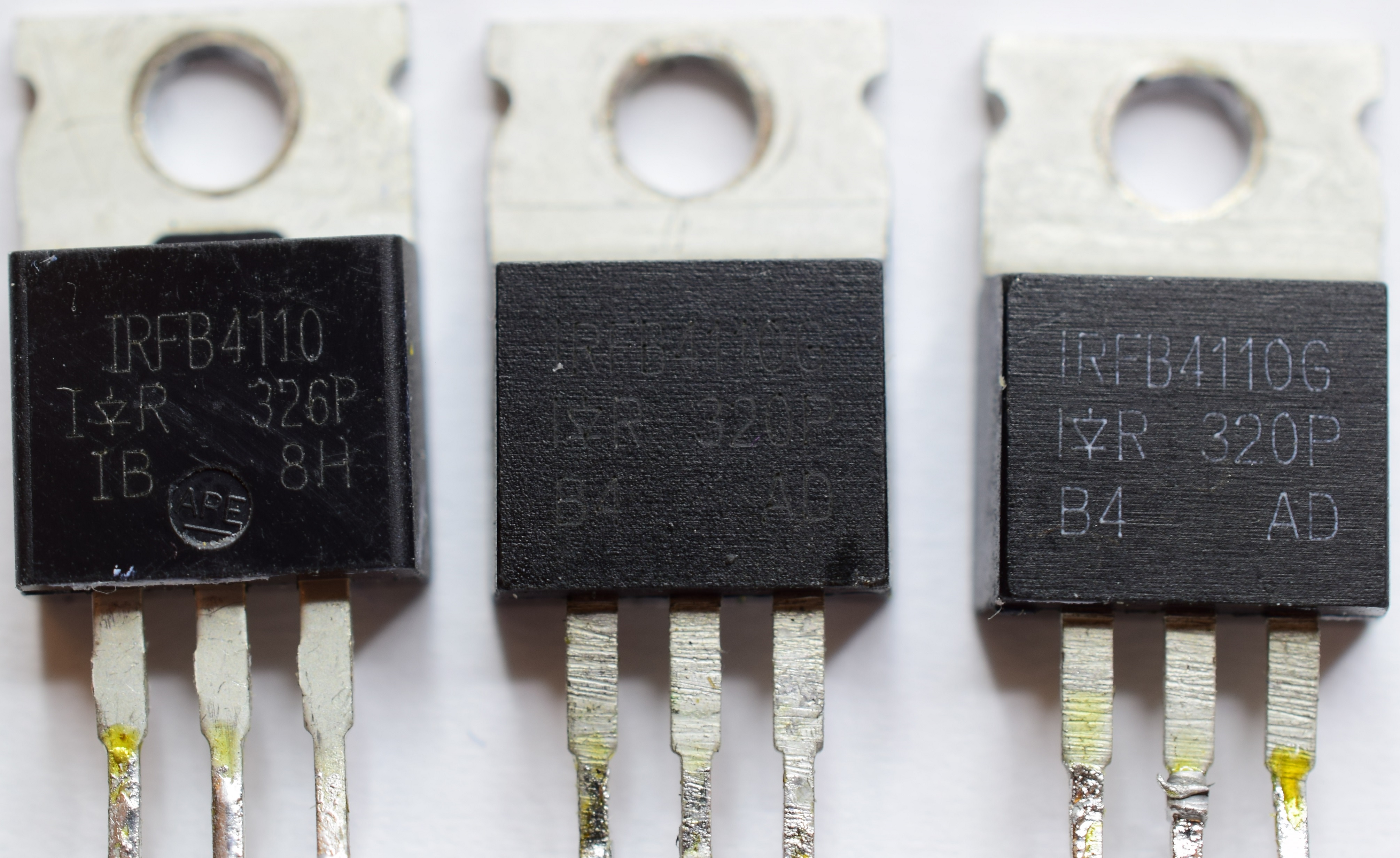 Rozhodl jsem se založit nové téma pro spínací tranzistory IRFB4110. Jelikož je relativně častým jevem havárie koncového stupně střídače a tento typ tranzistorů je často osazován a ještě častěji falsifikován, chtěl bych zde vyvolat diskusi zasvěcených o rozpoznání originálu od falsifikátu. Pro start přiložím pár fotografií tří kusů nakoupených ze tří zdrojů (všechno Čína), s nimiž mi střídače vždy na první připojení explodovaly, při čemž žádný z tranzistorů nebyl před osazením zkratovaný. Předpokládám že jsou to všecno falsifikáty. Zkuste se k nim vyjádřit, případně doplnit fotografie originálu, pokud jej vlastníte.