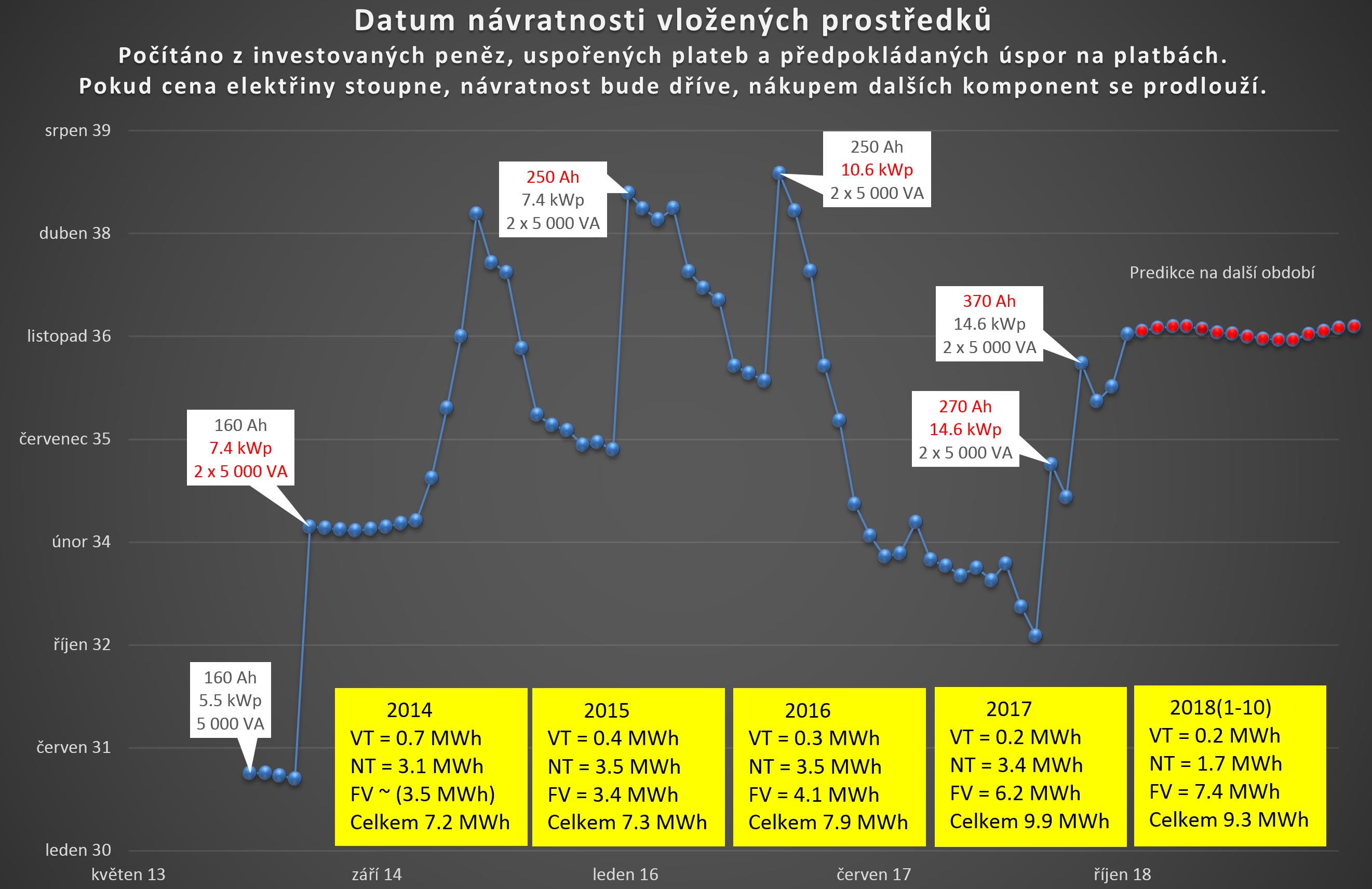 Kdo chce zaplakat, tak se může podívat, kdy se mi (ne)vrátí vložené prostředky do FV elektrárny. Do elektrárny jsem investoval postupně - v bublinách jsou popisy jak se elektrárna změnila. Každá změna znamenala utrácení peněz a to se okamžitě projevilo oddálením návratnosti dále do budoucnosti. Na druhou stranu každá změna přinesla zvýšenou výrobu (= spotřebu) a tedy se následně datum návratnosti přibližovalo.