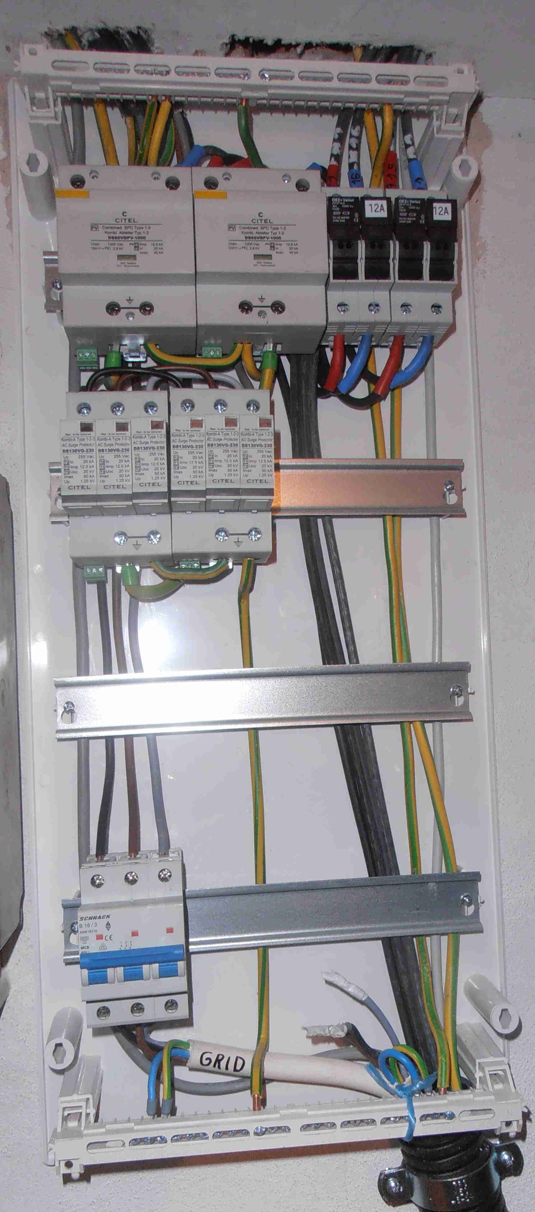 Také to zapojení svorek měniče v síti TNS je v tom návodu dost zvláštní. Vypadá to že tam při ostrovním provozu spínají relátkem N s PE a když náhodou nesepne nebo se to někde přeruší, tak nebude fungovat ochrana neživých částí jističi ani chrániči :evil: Pozor na to že svorka PE v řadě svorek EPS není s ničím spojená a vede zřejmě pouze na to relé. Standardní svorka PE spojená s šasi střídače, varistory, filtry atd... je hlouběji v přístroji jako šroub s maticí. Zapojil jsem to pro sít TNC (to v návodu chybí) a myslím že je to bezpečnější, nehrozí odpojení nulového vodiče a zničení spotřebičů a také přerušení spoje N s PE a nefunkčnost ochran a lze tak i dosáhnout nižší impedance. Dále na jednotlivé okruhy spotřebičů, světel a zásuvek už je klasická síť TNS.