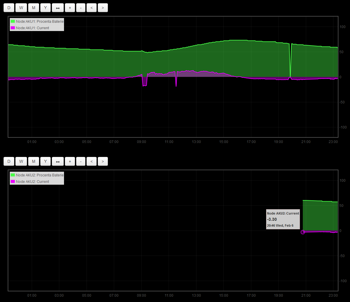 Před týdnem jsem konečně obdržel druhý battery box, čímž se mi povedlo zvednout kapacitu na celkových 20kWh. Při zapojování nového boxu jsem také učesal pár kabelů, takže až budu mít volnou chvilku, vyfotím aktuální stav. Dnes večer jsem nový box přidal do monitoringu, takže můžu samostatně sledovat/grafovat jak AKU1, tak AKU2. Zapojené jsou paralelně.