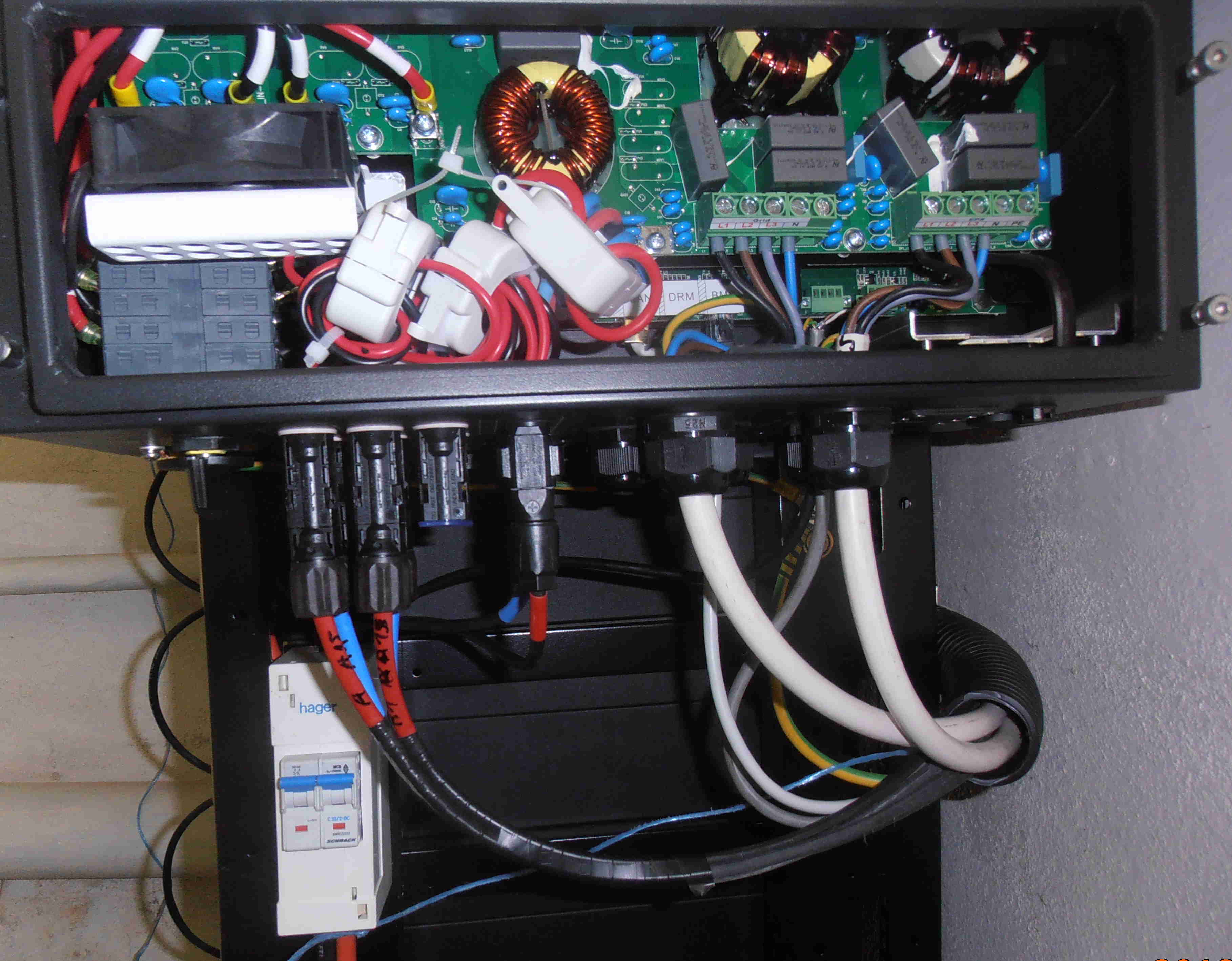 Pozor na to že svorka PE v řadě svorek EPS není s ničím spojená a vede zřejmě pouze na to relé. Standardní svorka PE spojená s šasi střídače, varistory, filtry atd... je hlouběji v přístroji jako šroub s maticí. Zapojil jsem to pro sít TNC (to v návodu chybí) a myslím že je to bezpečnější, nehrozí odpojení nulového vodiče a zničení spotřebičů a také přerušení spoje N s PE a nefunkčnost ochran a lze tak i dosáhnout nižší impedance. Dále na jednotlivé okruhy spotřebičů, světel a zásuvek už je klasická síť TNS.