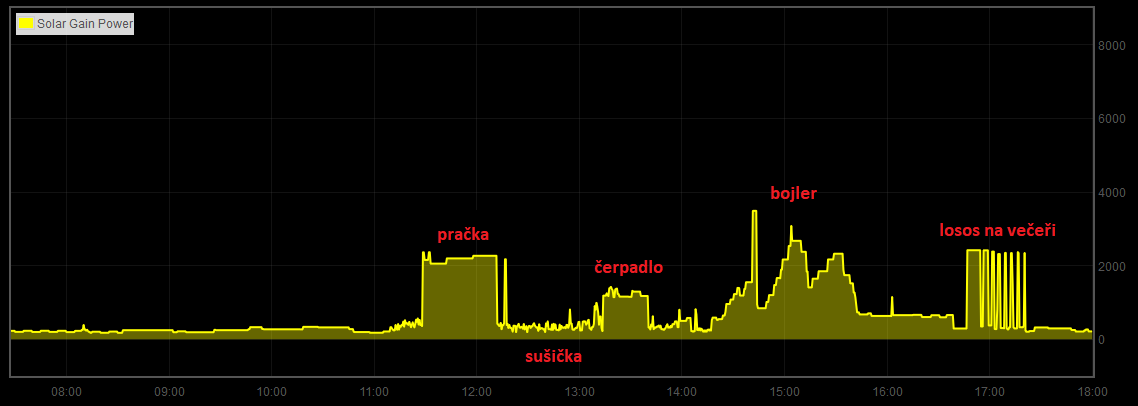 EDIT: Ještě výkon odebíraný z panelů, kromě pár špiček celý den jen ambientní světlo: