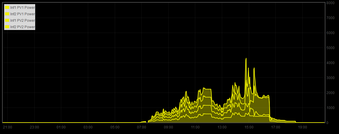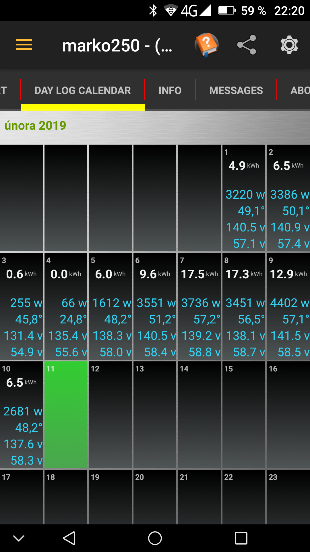 No u nás je to houpačka ve výrobě,dnes jen 3.6kWh,ale není to špatné zatím.Když se připočte ke každému zobrazenému dni asi 50% z vykázané hodnoty vyrobené navíc z JV pole na fasádě: