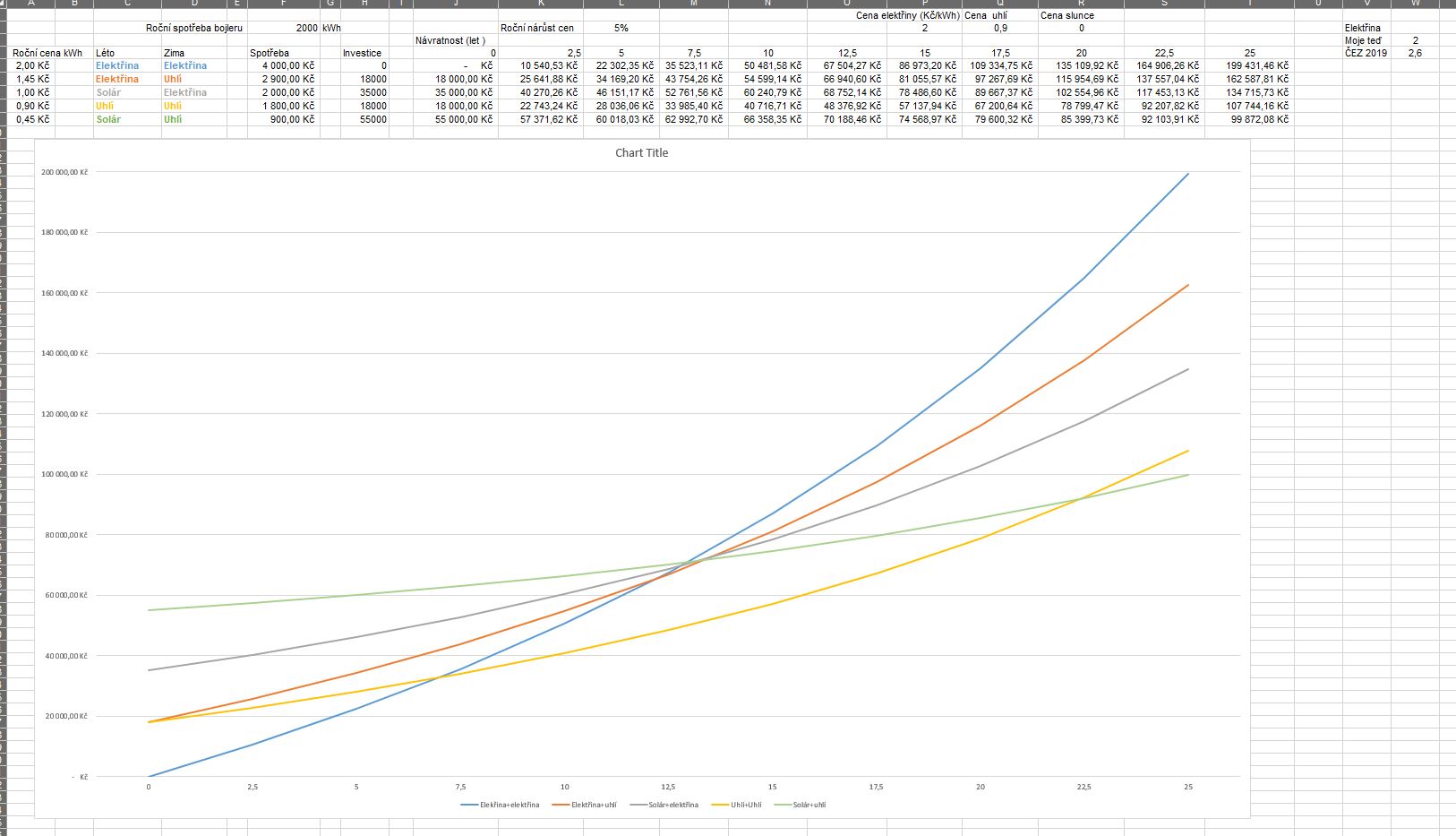 Investice do ohřevu uhlím znamená jiný bojler, nějaký čerpadlo, trubky. Investice do solárního ohřevu v tomto případě počítám 15 za jetý panely, 10 za Oplockého a 10 nějakou kabeláž, úchyty ( většina svépomocí ) atd. Ale jsou jen takový odhadnutý nástřely.