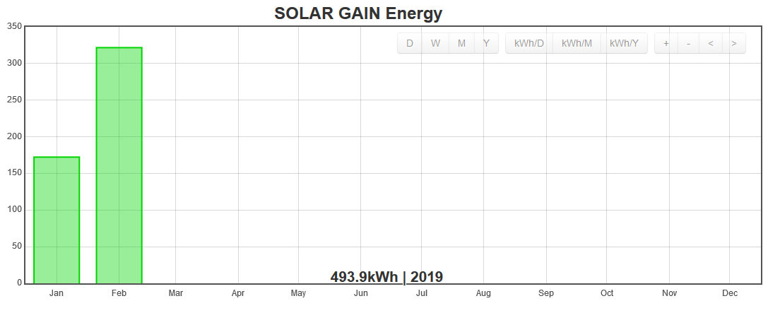 A takhle je to skoro celý Únor - docela dost toho zůstává na střeše a mne hlodá, jak to rozumně využít. Kdybych měl ongrid, byl by ten oblouk krásně hlaďoučký a elektroměr by se točil zpátky...achjo