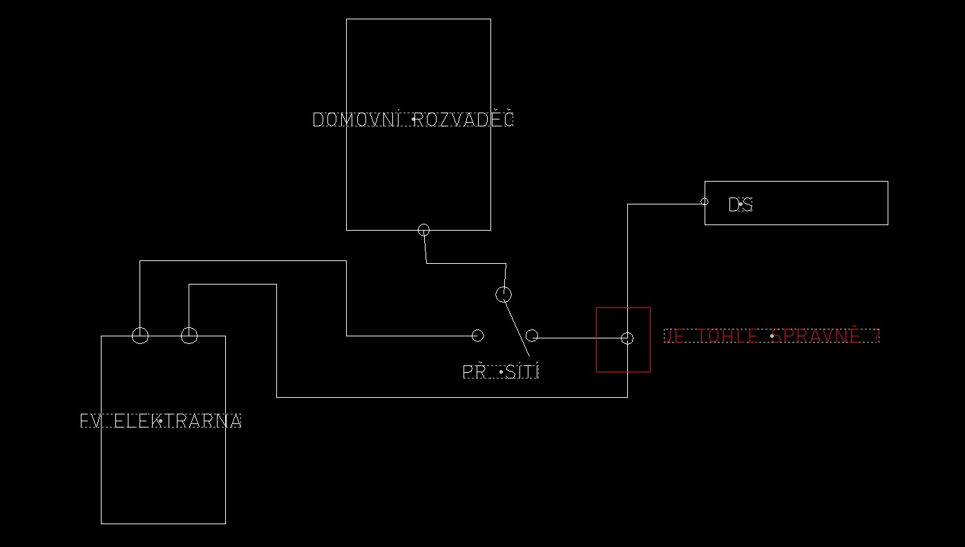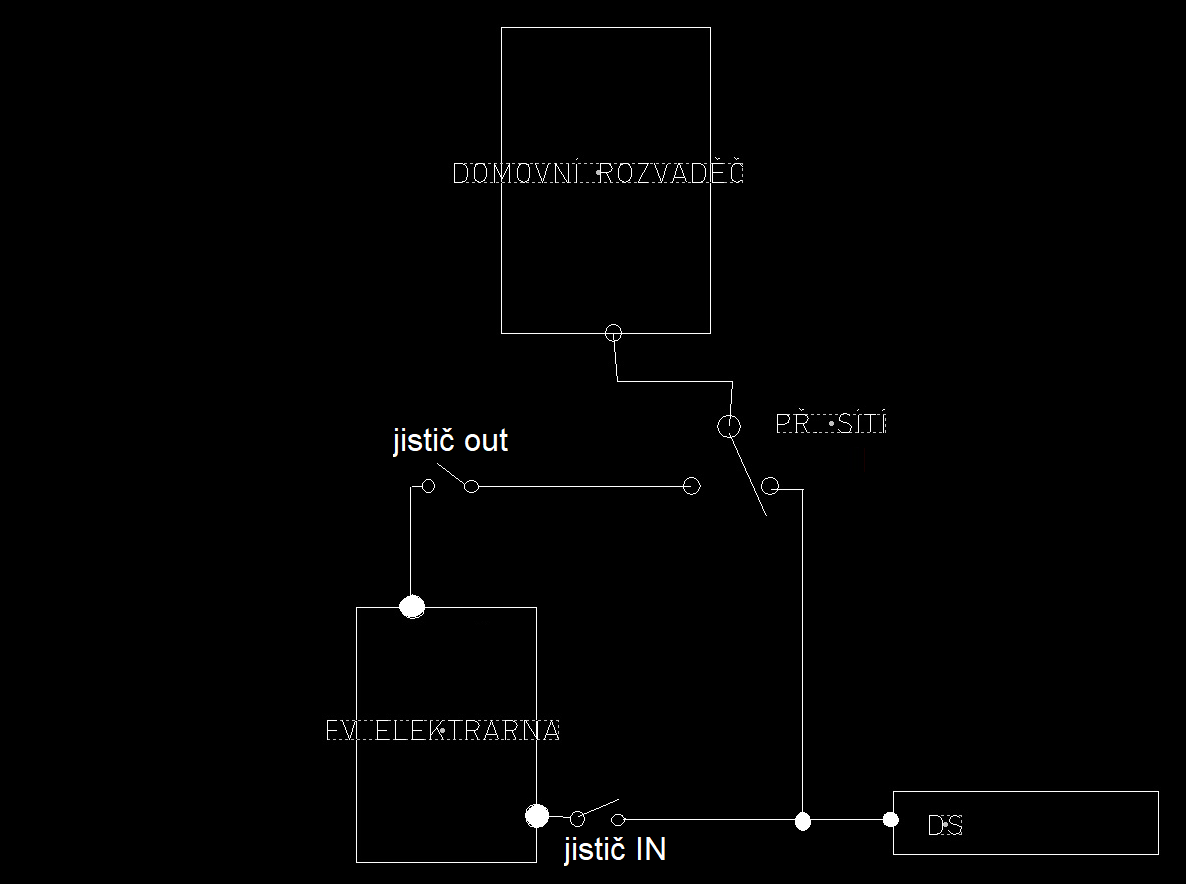 Pro lepší představu si to namaluj takto, a přidej vypínače (jističe) před a za měnič, aby ses v tom mohl hrabat.