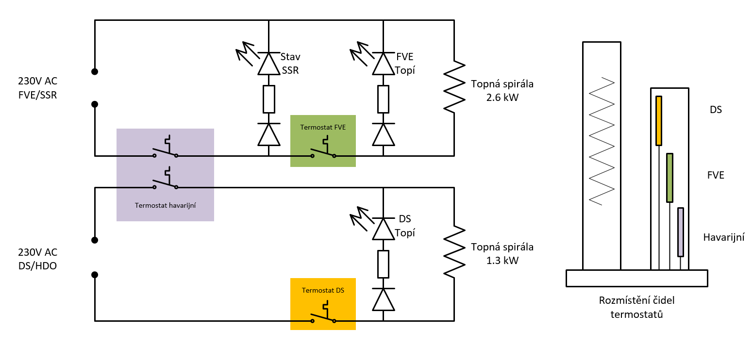 3) Havarijní termostat je nejníže. Ten by měl rozepnout skutečně až tehdy, když bude velmi horká voda i v nejspodnější části nádrže.
