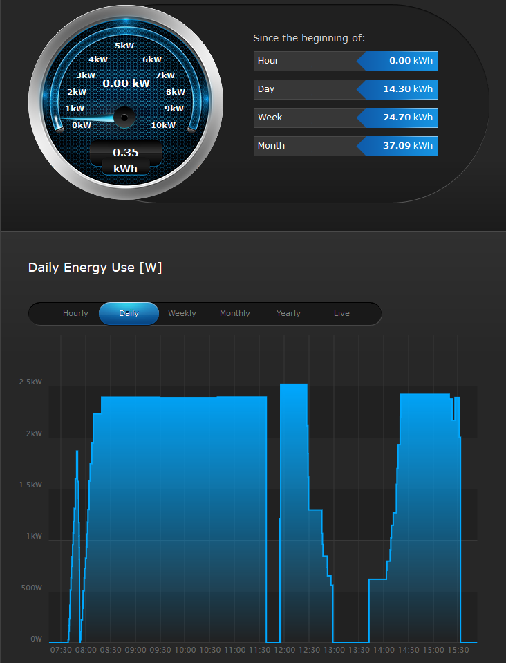A ještě graf spotřeby. Natopení 160L vody na teplotu cca 85°C sežralo cca 14.3kWh.