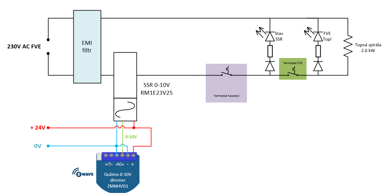3) Řídící napětí 0-10V je generováno pomocí bezdrátového zwave modulu Qubino Dimmer.