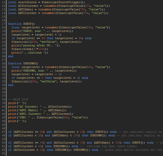4) Bezdrátový modul je řízen pomocí krátkého kódu v centrální jednotce domácí automatizace. Díky tomu lze přebytky využívat nejen po úplném nabití baterie, ale jsou konzumovány už ve fázi nabíjení. Zejména, pokud je nabíjecí proud zbytečně vysoký. Hodnoty nabíjecího proudu odečítám pouze z prvního batterypacku (200Ah 48V). Druhý battery pack je identický, zapojený paralelně. Pro funkci řízení přebytků jej tedy není třeba sledovat, jen je potřeba pamatovat, že skutečné hodnoty nabíjecího proudu a celkového náboje jsou dvojnásobné.