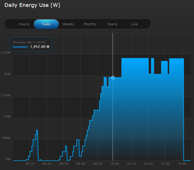 Schody v grafu níže znázorňují, jak automat hledá maximum přebytků. Rychlý propad dolů znamená mrak, případně zapnutí některého silného spotřebiče kdekoliv v domácnosti. To proto, aby celkový výkon obou měničů (10kW) byl přednostně dostupný spotřebičům a bojler si tedy bral energii jen tehdy, pokud nikde jinde není potřeba vysoký výkon: