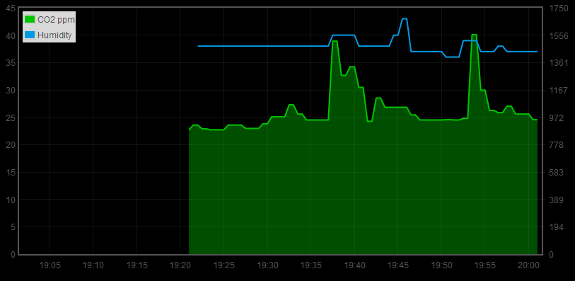 Měřák jsem samozřejmě připojil do Fibara, takže můžeme sledovat i grafický průběh hodnot CO2 a vlhkosti vzduchu.