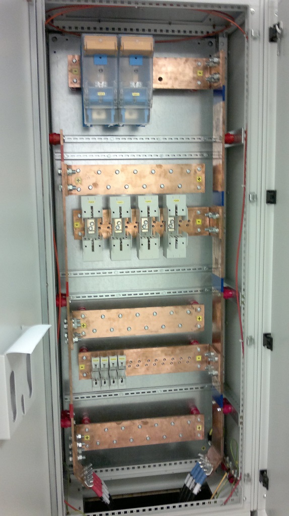 Nicméně nastal problém - jakékoliv logické umístění racku v rámci strojovny znamená natáhnout cca 10m kabelu, což při 50mm2 a 200A je tak 1V napěťový úbytek