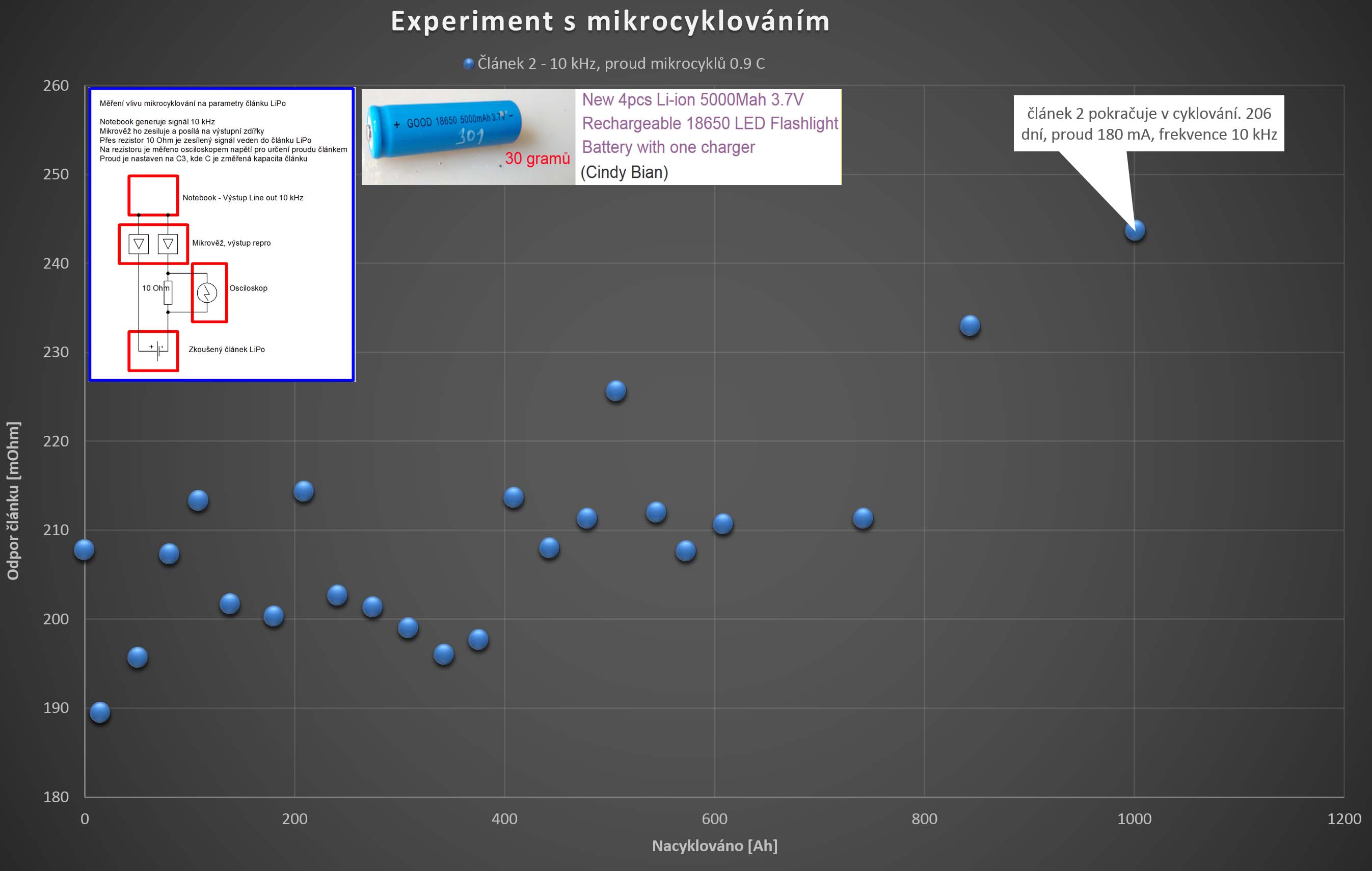 Trápím dál zbývající článek střídavým sinus napětím, které simuluje reálné mikrocyklování nabité baterie způsobené připojeným měničem nebo regulátorem. V předchozím grafu jsem měl chybu v jedné hodnoté, tady je to snad vše opraveno. Neděje se snad nic katastrofického, vypadá to, že kapacita pomalu klesá. Tak jednou týdně test přeruším, abych změřil kapacitu (uvedený je průměr ze 3 hodnot) a měřím taky vnitřní odpor (zatím nic zajímavého, tak neuvádím)