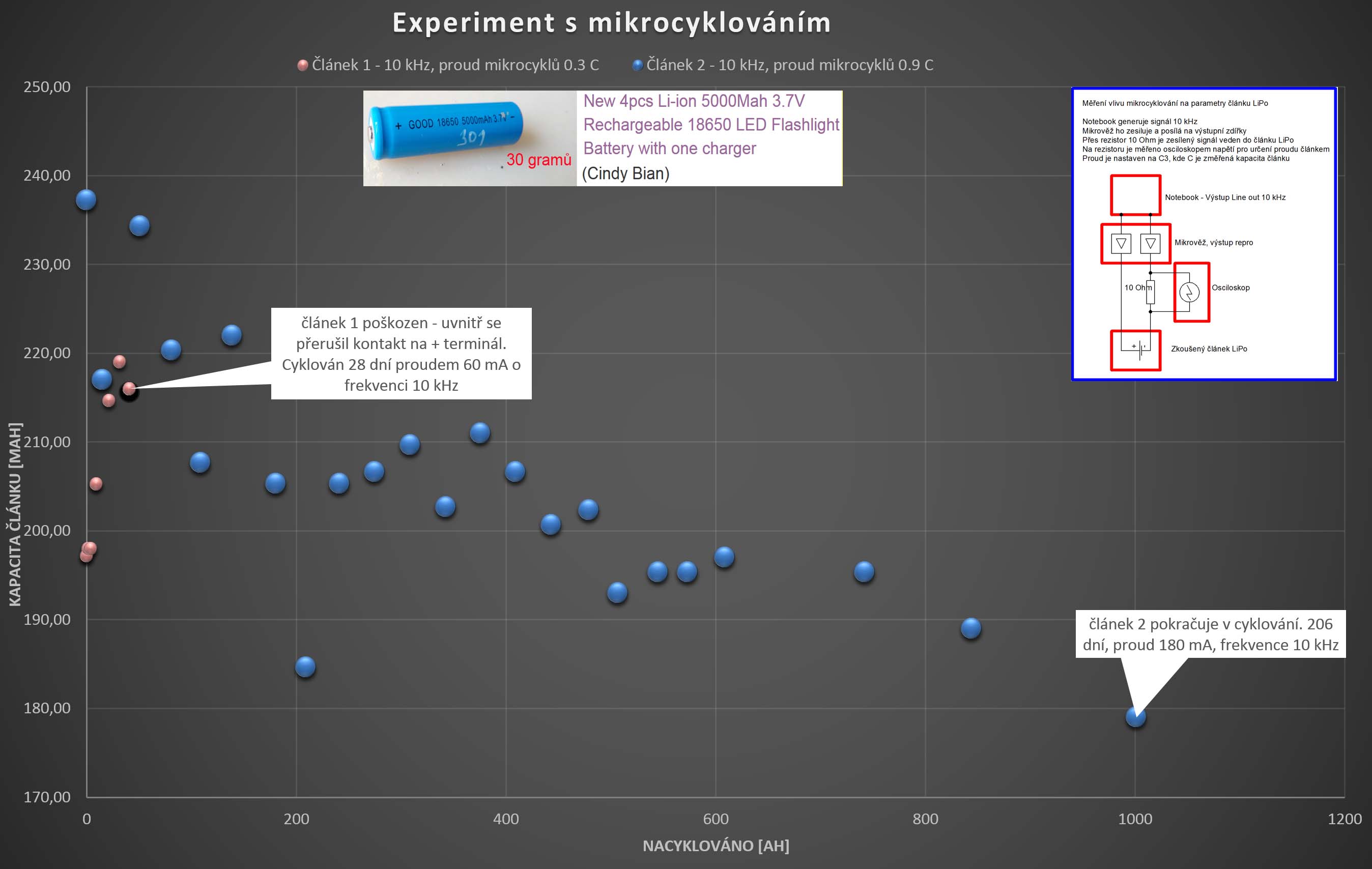 Test pokračuje, jen už kontrolu nedělám každý týden, ale méně často. Nacyklováno je přes 200 dnů a snad začíná stoupat vnitřní odpor a klesat kapacita. Pokud bych test začal znovu, tak bych už na začátku začal s články, které jsou v pořádku a ne tady s těmi, které byly nějaké čínské šmejdy.