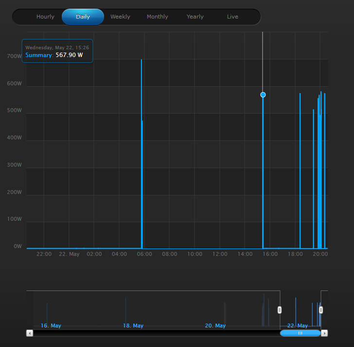 Mimochodem, graf spotřeby čerpadla ukazuje, že dnes hodně pršelo. Chudák soused, zase bude mít před vchodem povodeň: