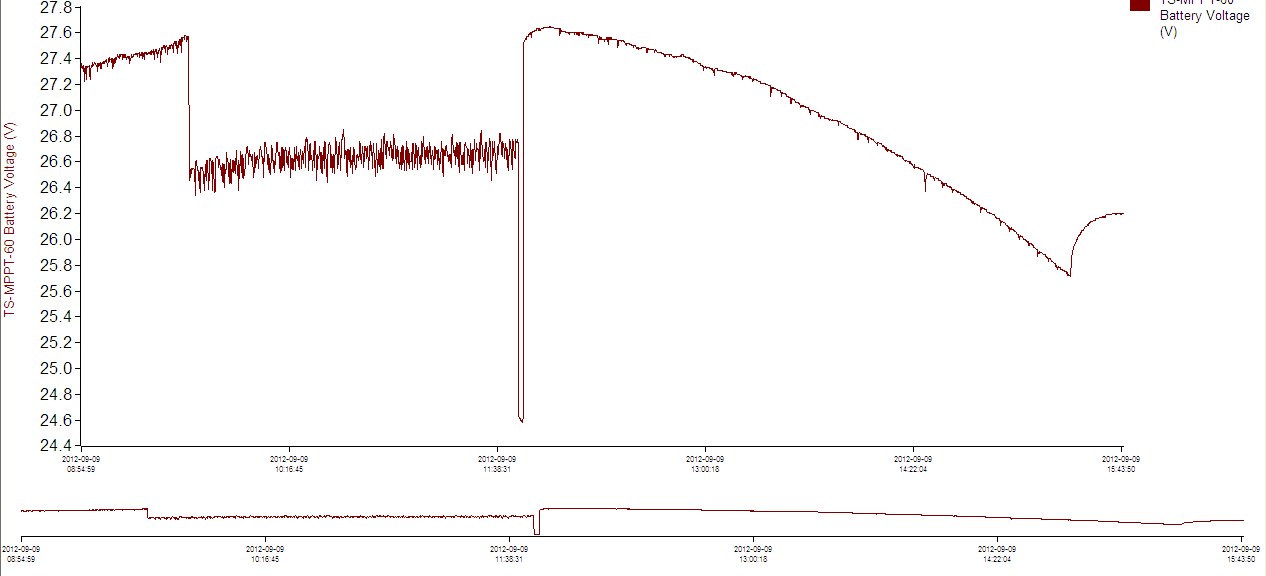 1/ Pozrite adminove grafy. V hornom grafe pokles ufv210 ( predpokladám, že napätie batérie ) na hodnotu pod 12 V pred 15:00 bol práve ten štuchanec, ktorý ukončil tzv. dieru v nabíjaní. Opravujem sa hneď, bol primárne pokles napätia FV poľa, čo zrejme ukončilo float.