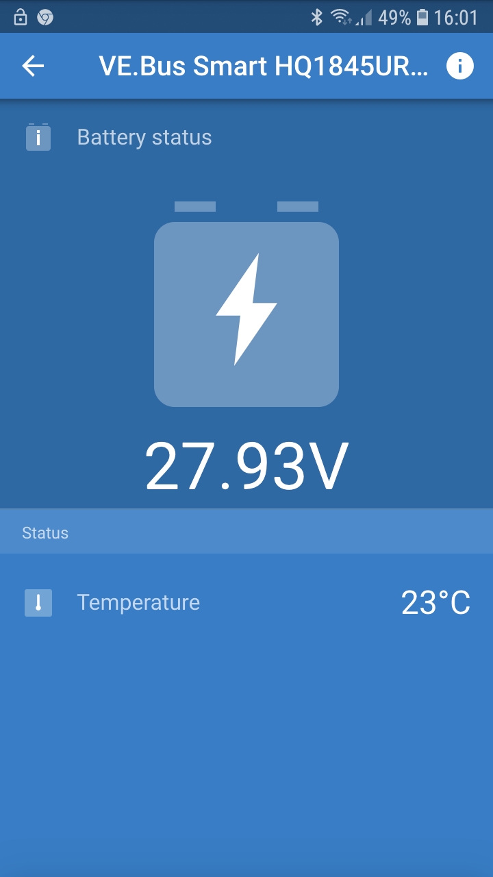 Ešte som dnes napojil VE-bus Smart Dongle, ktorý ukazuje napatie druhej baterky