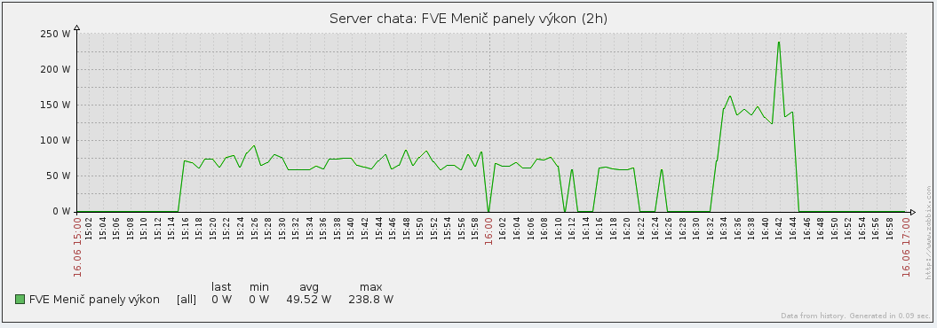 Axpert v odpovědi na dotaz QPIGS dává v části "PV Input current" informace zaokrouhlené na celé ampéry, takže to není vypovídající, lepší je použít část "PV Charging power" kde je skutečný výkon panelů. Musím si upravit monitoring.