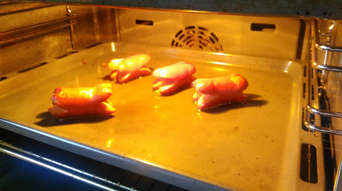 Návod je prostý: Nakrájí se špekáčky na kousky (tvar nehraje v chuti velkou roli, gurmáni oloupou i střívko) nakrájí se cibule na kolečka, do vymazané zapékací misky se dá vrstva cibule, špekáčků, cibule...atak dokola, dokud je co. Končí se cibulí. Zalije se směsí chili pasty, ostrého kečupu, směsi na steak a černého piva.