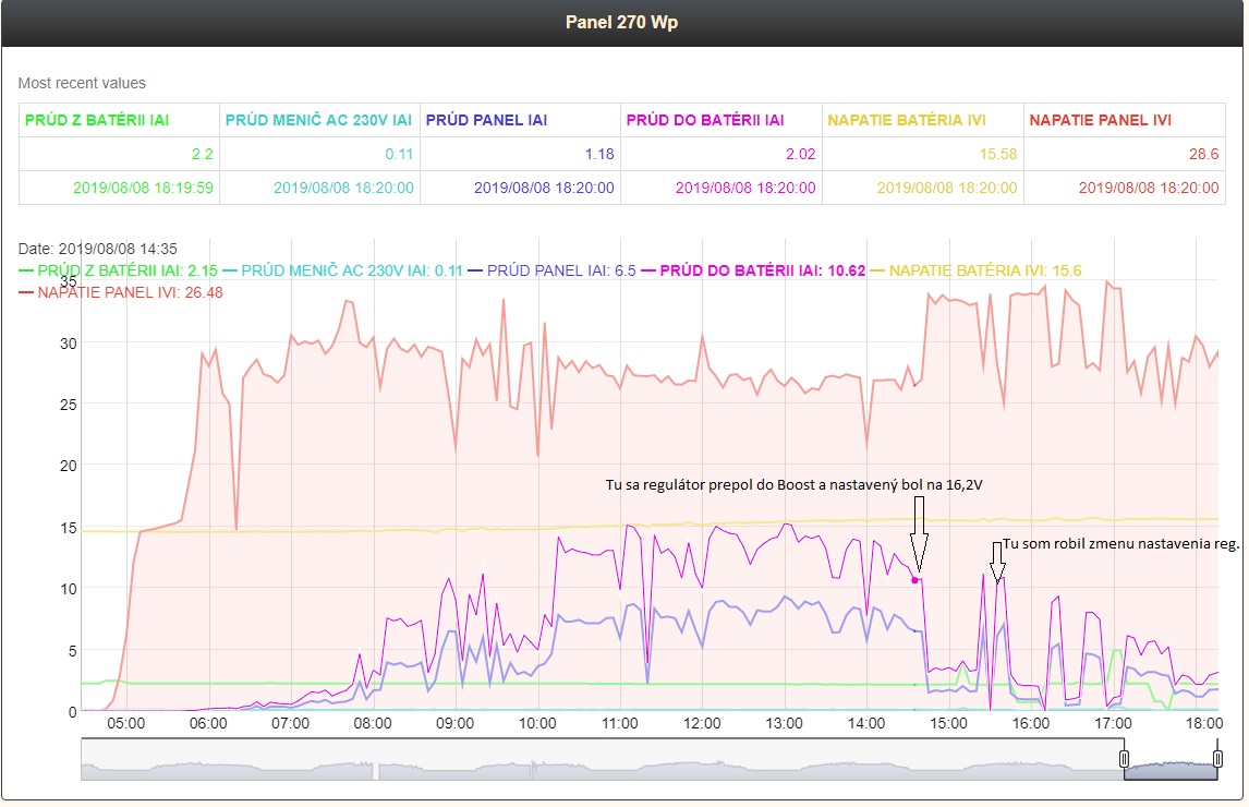 Vyskúšal som všetko čo ste mi poradili, no nepomohlo. Regulátor si stále robil len to svoje. Keď bolo napätie batérii 15,6V obmedzil prúd, no regulátor bol nastavený na 16,2V. Alebo po každej zmene nastavení nabehol režim MPPT a zhruba do 10 min sa prepol do režimu Boost a obmedzil prúd, bez ohľadu nato, čo som tam nastavil.