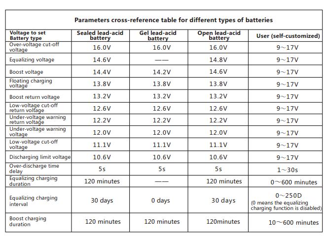 • Over-voltage cut-off voltage > Charging limit voltage ≥ Equalizing voltage ≥ Boost voltage ≥ Floating