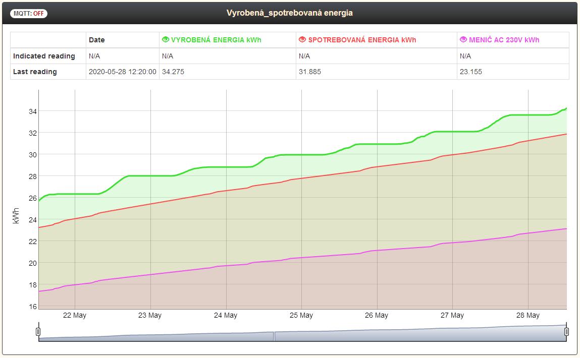 Taktiež počíta celkovú energiu v kWh, vyrobenú panelom, regulátorom, meničom a spotrebovanú meničom.