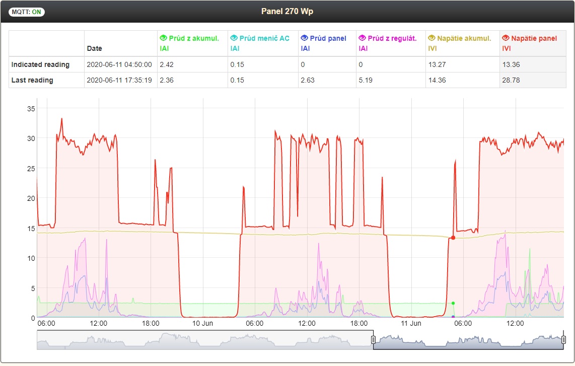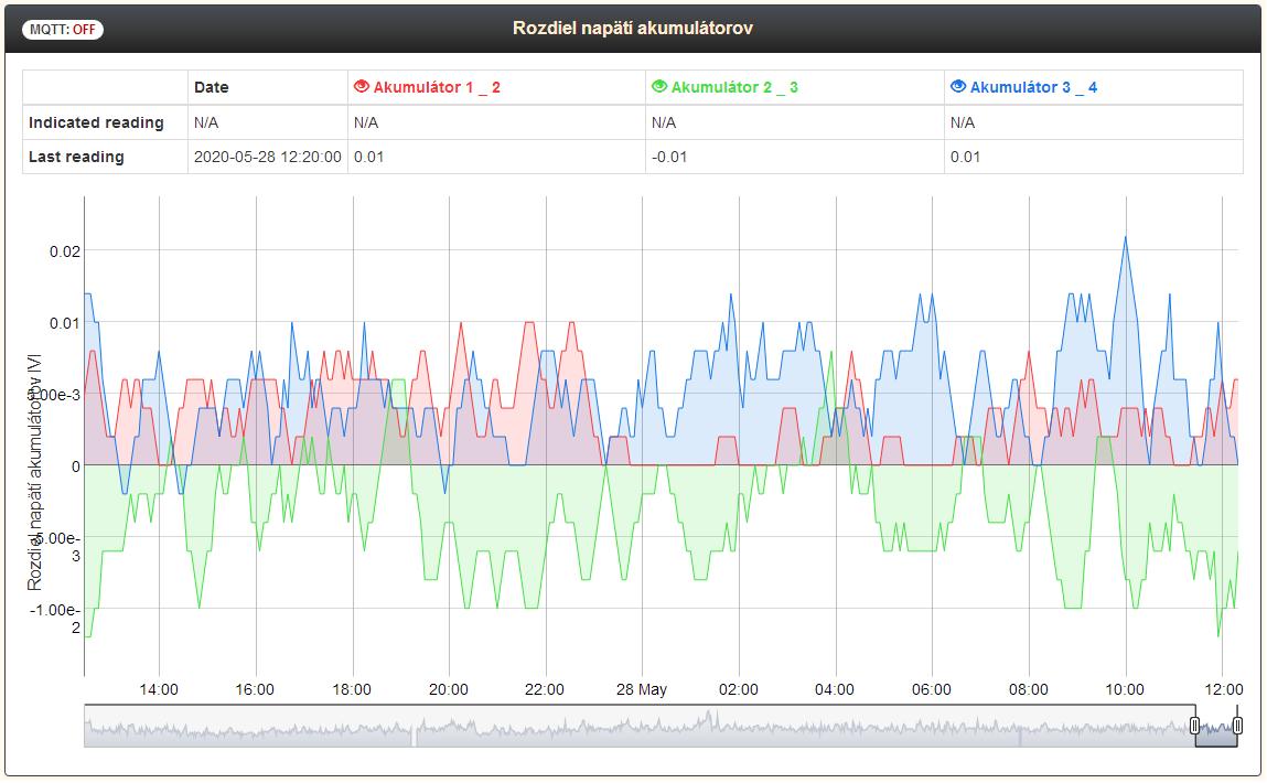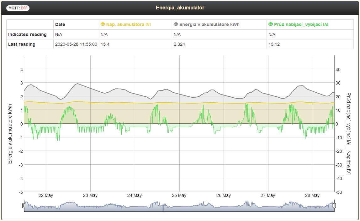 Cez LK a MQTT server sa robí aj záznam prúdu nabíjania a vybíjania. Taktiež sa zaznamenáva napätie a energia ktorá je uložená v akumulátore.